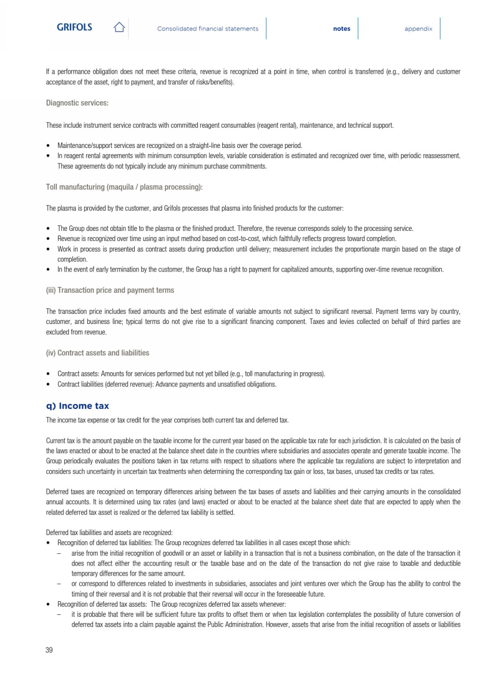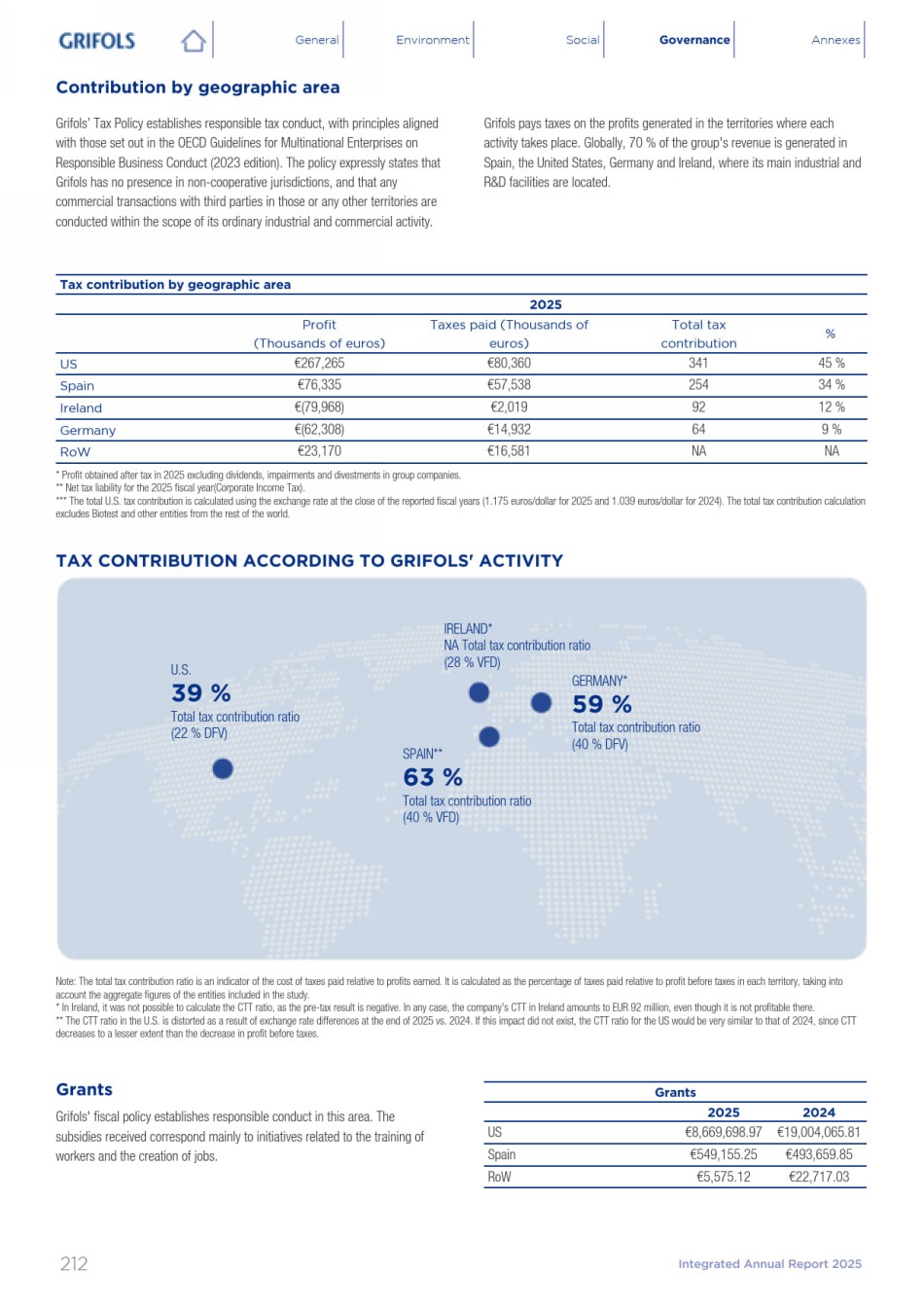 地理区域贡献Grifols的税收政策确立了负责任的税收行为,其原则与经合组织《跨国企业负责任商业行为指南》(2023年版)中规定的原则保持一致。该政策明确指出,Grifols在非合作司法管辖区没有存在,在这些或任何其他领土上与第三方进行的任何商业交易都是在其普通工商业活动范围内进行的。Grifols为在每项活动发生的地区产生的利润纳税。在全球范围内,该集团70%的收入产生于西班牙、美国、德国和爱尔兰,其主要工业和研发设施都位于这些地区。按地理区域划分的税收贡献2025利润(千欧元)已缴税款(千欧元)总税收贡献% US欧元267,265欧元80,36034145%西班牙欧元76,335欧元57,53825434%爱尔兰欧元(79,968)欧元2,0 199212%德国欧元(62,308)欧元14,932649%行欧元23,170欧元16,581 NA NA*2025年除税后取得的利润,不包括集团企业的股息、减值和撤资。**2025财年净应纳税额(企业所得税)。***美国的税收贡献总额是使用报告财年结束时的汇率计算的(2025年为1.175欧元OS/美元,2024年为1.039欧元/美元)。总税收贡献计算不包括Biotest和世界其他地区的其他实体。根据GRIFOLS活动的税收贡献注:总税收贡献比率是所支付的税收成本相对于所赚取的利润的一个指标。它的计算方法是,考虑到研究中包括的实体的汇总数字,每个地区的已缴税款相对于税前利润的百分比。*在爱尔兰,由于税前结果为负值,因此无法计算CTT比率。无论如何,该公司在爱尔兰的CTT达9200万欧元,即使那里没有盈利。**由于2025年底与2024年的汇率差异,美国的CTT比率被扭曲。如果不存在这种影响,美国的CTT比率将与2024年非常相似,因为CTT下降的程度低于税前利润的下降幅度。Grants Grifols的财政政策在这一领域确立了负责任的行为。获得的补贴主要对应于与培训工人和创造就业机会有关的举措。赠款20252024年8,669,698.97欧元19,004,065.81西班牙欧元549,155.25欧元493,659.85行欧元5,575.12欧元22,717.03一般环境社会治理附件212综合年度报告2025爱尔兰*NA总税收贡献比例(28% VFD)德国*59%总税收贡献比(40% DFV)西班牙**63%总税收贡献比(40% VFD)美国39%总税收贡献比(22% DFV)