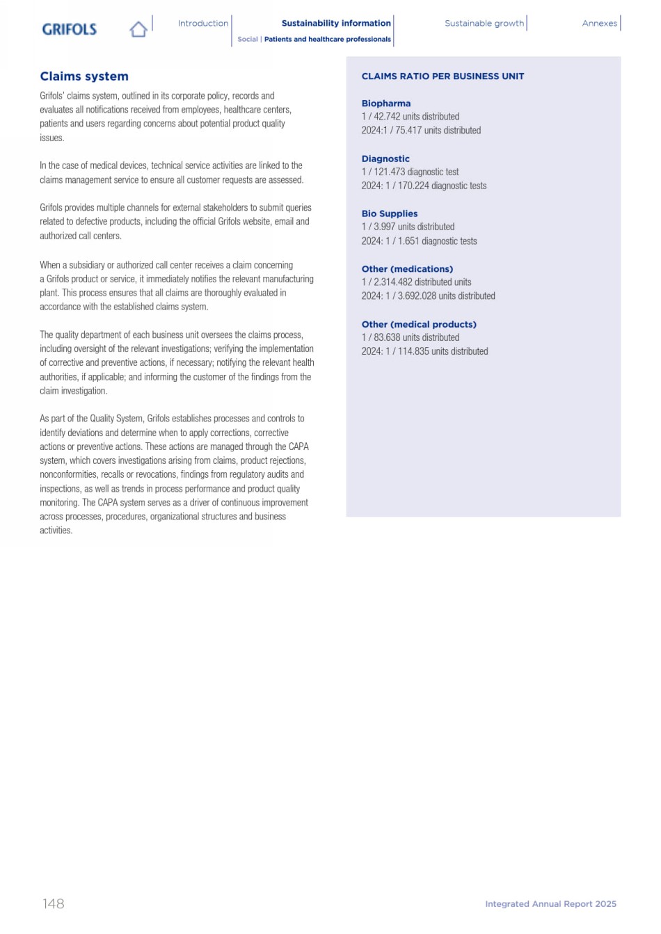 负责任的营销实践Grifols开发血浆衍生药物,用于治疗世界各地患有慢性和罕见、可能危及生命的疾病的患者。这些疗法仅通过有执照的医疗保健专业人员的处方提供。Grifols在全球范围内针对医疗保健专业人员开展营销活动,以支持最佳的患者治疗。该公司不开展全球直接面向消费者的营销活动。在美国,Grifols通过直接面向消费者的教育和宣传举措来补充这些努力。这些活动可能有品牌或无品牌,通过数字平台、印刷媒体和会议活动等渠道提供。它们的主要目的是增强患者教育、疾病意识和对诊断的理解,同时确保与伦理标准和监管要求保持一致。公司确保所有营销活动和宣传或教育材料均符合适用的法律法规,符合组织自愿采用的行业政策和守则,适合目标受众,并呈现真实、可靠、完整和平衡的信息。Grifols遵循Compliance设计的标准操作程序,该程序定义了与所有营销计划的批准、审查和控制相关的活动和责任。除其他外,这包括参加患者和医疗保健大会,以及开发和分发针对外部受众的有关Grifols产品和服务的宣传和教育材料。所有营销和患者指导的材料都通过Grifols审查流程(GRP)进行管理,该流程定义了审查和批准程序,以确保遵守适用的准则和负责任的营销做法。这一过程涉及法律、医疗和监管部门的监督,使用专门为GRP设计的专用电子系统。通过这种严格的审查,Grifols确保所有通信都坚持独立性、透明度和职业道德原则。所有营销材料和内容在指定国家被批准用于特定用途,并且只能在没有更改的情况下使用。对所有宣传和教育材料的内容进行例行审查,以确保符合现行法规和守则。Grifols还根据其行为准则和反腐败政策提供有关负责任的销售和营销实践的培训。此外,商业学习与发展区域提供课程,通过将产品知识培训与核心技能开发相结合,加强销售团队。这些计划的结构旨在实现利益相关者的有效参与,同时支持合规和业务增长。2025年,提供322个课程,惠及1068名员工,占19359个培训小时。2025年,收到1起营销相关索赔,并按照既定内部程序进行管理,无财务影响。在前几年,2024年记录了三项索赔,产生的总财务影响为12,000欧元,而2023年收到了一项索赔,没有相关的财务影响。包装、传单和标签产品包装、传单和标签中包含的信息遵守Grifols经营所在的每个国家的适用标准和法规,包括医药产品的良好生产规范(GMP)。对于医疗器械和体外诊断医疗器械,仪器和软件的标签、使用试剂说明和用户手册,遵守国家特定法规,(EN ISO 15223等)并纳入通过医疗器械风险管理系统(EN ISO 14971)确定的缓解措施或卫生当局的要求。所有印刷材料均被翻译成相关语言,并根据需要定期更新,便于用户查阅。截至2025年,Grifols没有记录任何与其产品和服务的信息或标签相关的不合规事件。2024年或2023年没有此类事件的报告。所有信息和标签材料均按照内部质量控制程序和适用法规进行审查和批准。导言可持续发展信息可持续增长附件社会|患者和医疗保健专业人员153综合年度报告20254,780材料审查材料批准4,8635,1594,1674,3474,689
