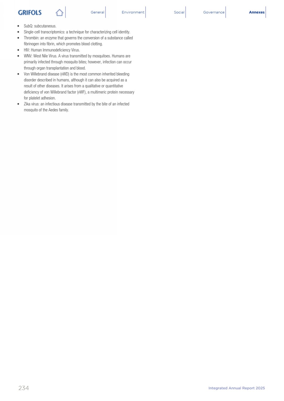 •免疫血液学:血液学的一个分支,涉及抗原和抗体的研究,它们对血液的影响,以及血液紊乱与免疫系统的关系。这一分支通常被称为“输血医学/血库”;其活动包括血型、交叉匹配、抗体鉴定。•免疫学:生物医学科学的一个分支,涵盖生物体免疫系统各个方面的研究。它包括健康和疾病状态下的生理功能;功能障碍(自身免疫性疾病、超敏反应、免疫缺陷、移植排斥);以及体外、原位和体内免疫系统成分的物理、化学和生理特征。•静脉注射:将药物或液体直接注入静脉。• ITP:免疫性血小板减少症。一种自身免疫性疾病,患者产生抗血小板自身抗体和专门的白细胞,破坏他们的血小板。这导致血小板计数低(血小板减少),可能导致过度瘀伤或出血。• IVD:体外诊断。• MAB:单克隆抗体:一种由单克隆细胞产生的抗体,常用于免疫疗法(如治疗自身免疫性或炎症性疾病和癌症)、诊断测试以及细胞鉴定和追踪。单克隆抗体是免疫学的基石,越来越多地被用作治疗剂。•输血医学:医学的一个分支,其中包括免疫血液学、血型分析以及血液和血浆的病毒分析。• MG:重症肌无力。一种慢性、自身免疫性神经肌肉疾病,会导致骨骼肌无力,活动一段时间后会恶化,休息一段时间后会好转。这些肌肉负责与呼吸和身体部位运动有关的功能。• MRB:市场研究局。• NAT:核酸扩增试验。•肺科:这是一个专注于呼吸系统健康的医学分支。肺科医生治疗一切与呼吸系统有关的疾病,从哮喘到肺结核。•神经学:研究神经和神经系统的解剖学、功能和器质性紊乱的科学。•北美:包括美国和加拿大•眼科:医学和外科分支,处理眼科疾病的诊断和治疗。•大流行:一种新疾病的全球传播。•帕金森病:一种复杂的神经退行性疾病,其中每个患者经历不同的运动和非运动症状组合• PCR:聚合酶链反应。一种广泛使用的方法,可快速制作数百万至数十亿个特定DNA样本的拷贝,使科学家能够采集非常小的DNA样本并将其放大到足以详细研究的数量。• pdFVIII:血浆衍生因子VIII。•大疱性类天疱疮:是一种自身免疫性疾病,发生在免疫系统攻击皮肤并引起水疱时,在老年人中更常见•血浆:血液中由溶液中大量蛋白质组成的液体部分。•脂性血浆:具有混浊和/或乳状外观的血浆,由血液中主要是胆固醇和/或甘油三酯的过量脂质(高脂血症)产生,这在某些情况下变得明显。•血浆蛋白质组学:是一个术语,描述使用非常强大、灵敏和特定的仪器对血浆生物标志物进行高通量分析。•回收血浆:来自献血采集的全血的血浆•血浆置换术:一种将血浆与其他血液成分,如红细胞、血小板和其他细胞分离的技术。这些未使用的血液成分悬浮在盐水溶液中,立即重新注入捐献者体内。因为捐献者只提供血浆,不提供全部血液,所以康复过程更快,耐受性更好,让捐献者能够更频繁地捐献。血浆置换术由Josep Antonio Grifols Lucas于1951年开发。它是唯一能够获得足够数量的血浆以满足制造血浆蛋白需求的程序。•血浆衍生蛋白:这些是通过分离人血浆获得的具有治疗特性的纯化血浆蛋白。血浆蛋白主要有白蛋白、免疫球蛋白、VIII因子、α-1抗胰蛋白酶。•蛋白质组:生物体从其基因合成的一整套蛋白质,赋予细胞其个体特征。这组蛋白质决定了有机体是什么样的,它们的身体如何运作,以及它们的行为方式。• PPTA:血浆蛋白治疗协会• Prolastin®/Prolastin®-C:浓缩形式的Alpha-1抗胰蛋白酶(AAT),源自人血浆,独家批准用于慢性, 在患有遗传性AAT缺陷的个体中进行持续替代治疗。Prolastin会增加血液和肺部的AAT水平。增加的AAT水平可能有助于减少破坏性酶引起的肺损伤。• rFVIII:抗嗜血因子A,采用重组DNA技术获得。利用这项技术,纯因子在实验室合成,而不是从血浆中提取。• Recombinant:一种利用重组技术制备的蛋白质,由被操纵的基因编码。这些程序用于连接无细胞系统(细胞有机体之外的环境)中的片段。它们被称为非常有效的药物,可以避免副作用,并且比小分子更快地被开发出来。• RoW:世界其他地区• SARS-CoV-2:严重急性呼吸综合征冠状病毒2。导致2019年新冠病毒疾病的毒株(COVID-19),导致COVID-19大流行的呼吸道疾病。• SCIG:皮下免疫球蛋白•纤维蛋白密封剂:血浆来源手术粘合剂。• RH(恒河猴)血型系统:ABO之后最重要的血型系统。RH血型系统由50种明确的血型抗原组成,其中D、C、c、E、e五种抗原最为重要。常用术语RH因子、RH阳性、RH阴性专指D抗原。•美国单采学会(ASFA):一个由医生、科学家和相关卫生专业人员组成的组织,其使命是通过教育、循证实践、研究和倡导,为患者、捐赠者和从业者推进单采医学。• IV溶液/静脉溶液:药物或液体物质的均匀混合物,允许其用针头注入循环系统。大环境社会治理附件233综合年度报告2025