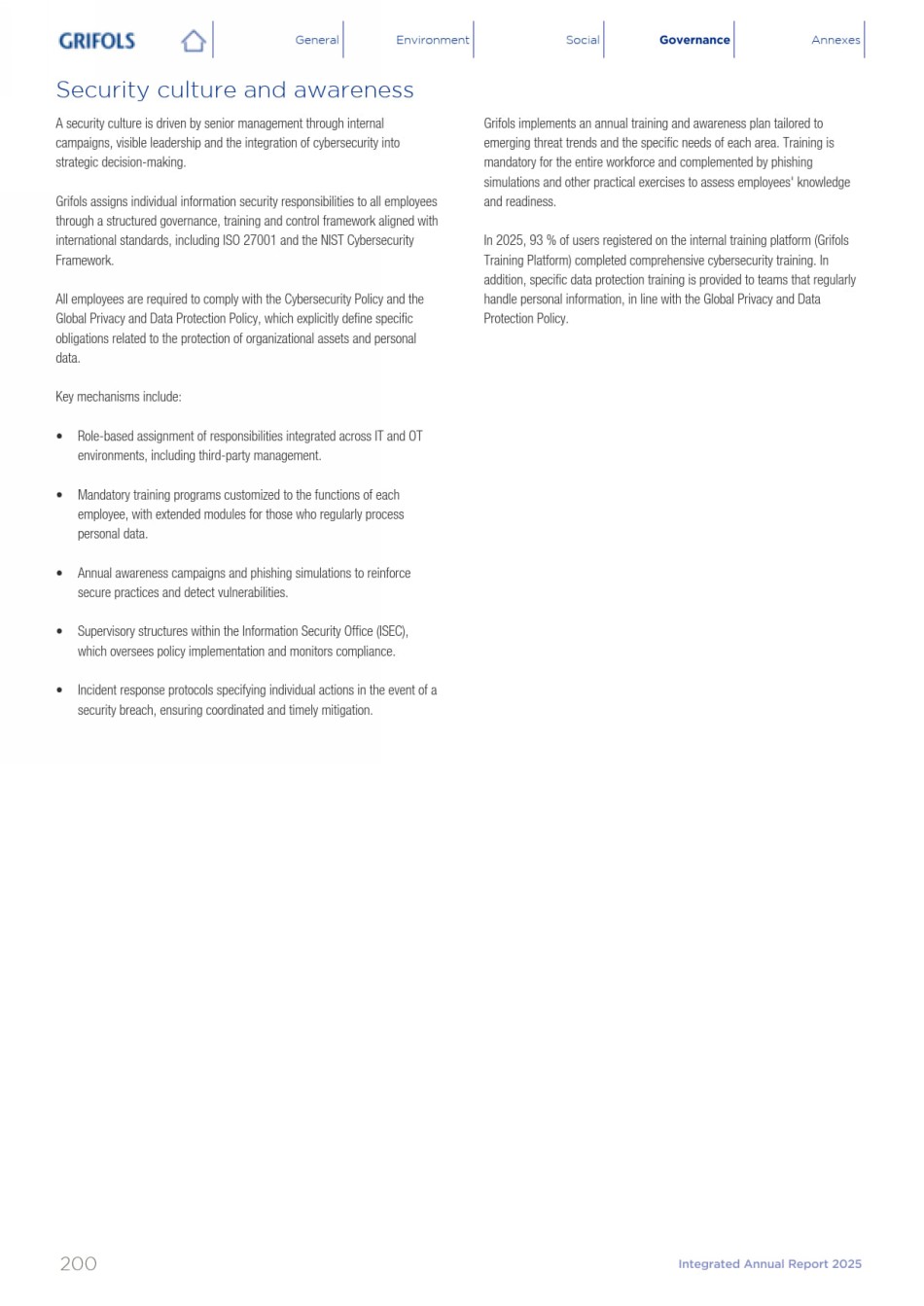 安全文化和意识一种安全文化是由高级管理层通过内部运动、可见的领导和将网络安全融入战略决策来推动的。Grifols通过与国际标准(包括ISO 27001和NIST网络安全框架)保持一致的结构化治理、培训和控制框架,将个人信息安全责任分配给所有员工。要求所有员工遵守《网络安全政策》和《全球隐私和数据保护政策》,其中明确定义了与保护组织资产和个人数据相关的具体义务。关键机制包括:•跨IT和OT环境集成的基于角色的职责分配,包括第三方管理。•根据每位员工的职能定制的强制性培训计划,为定期处理个人数据的人员提供扩展模块。•年度提高认识运动和网络钓鱼模拟,以加强安全做法并检测漏洞。•信息安全办公室(ISEC)内的监督结构,负责监督政策实施并监测遵守情况。•事件响应协议指定发生安全漏洞时的个人行动,确保协调和及时的缓解。Grifols实施一项针对新出现的威胁趋势和每个地区具体需求的年度培训和认识计划。培训对整个员工队伍都是强制性的,并辅以钓鱼模拟和其他实际练习,以评估员工的知识和准备情况。2025年,在内部培训平台(Grifols Training Platform)注册的用户中,93%完成了全面的网络安全培训。此外,根据全球隐私和数据保护政策,向定期处理个人信息的团队提供特定的数据保护培训。大环境社会治理附件200综合年度报告2025