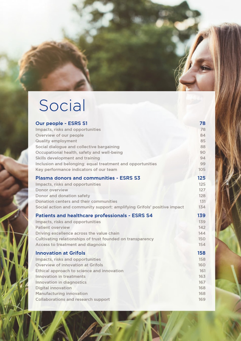 指标和目标DR S1-5与管理重大负面影响、推进积极影响、管理重大风险和机遇相关的目标78-79DR S1-6企业员工的特征105-113DR S1-7企业自身员工队伍中非员工的特征90-91、93,95 DR S1-8集体谈判覆盖和社会对话87-88 DR S1-9多样性指标104-109 DR S1-10充足工资85-86 DR S1-11社会保护86-87 DR S1-12残疾人99,101 DR S1-13培训和技能发展指标96,113-114 DR S1-14健康和安全指标89-93,117-118 DR S1-15工作-生活平衡指标116。Grifols正在努力扩大这些信息。DR S1-16薪酬指标(薪酬差距和总薪酬)103-104、119-124 DR S1-17事件、投诉和严重人权影响100-102、191-192 ESRS S2与ESRS 2相关的价值链战略DR中的工人SBM-2利益相关者的利益和观点不是与ESRS 2相关的重大DR SBM-3实质性影响、风险和机会及其与战略和商业模式的相互作用不是实质性影响,风险和机会管理DR S2-1与价值链工人相关的政策不重要DR S2-2与价值链工人接触影响的过程不重要DR S2-3纠正负面影响的过程和价值链工人提出关切的渠道不重要DR S2-4就对价值链工人的实质性影响采取行动,以及管理与价值链工人相关的物质风险和寻求物质机会的方法,这些行动的有效性不重要指标和目标DR S2-5与管理重大负面影响、推进积极影响以及管理重大风险和机会相关的目标不重要ESRS S3受影响的社区战略DR与ESRS 2相关的SBM-2利益相关者的利益和观点15-16,126,159 DR与ESRS 2 丨SBM-3重大影响、风险和机会及其与战略和商业模式的相互作用125披露要求内容页号一般环境社会治理附件221综合年度报告2025