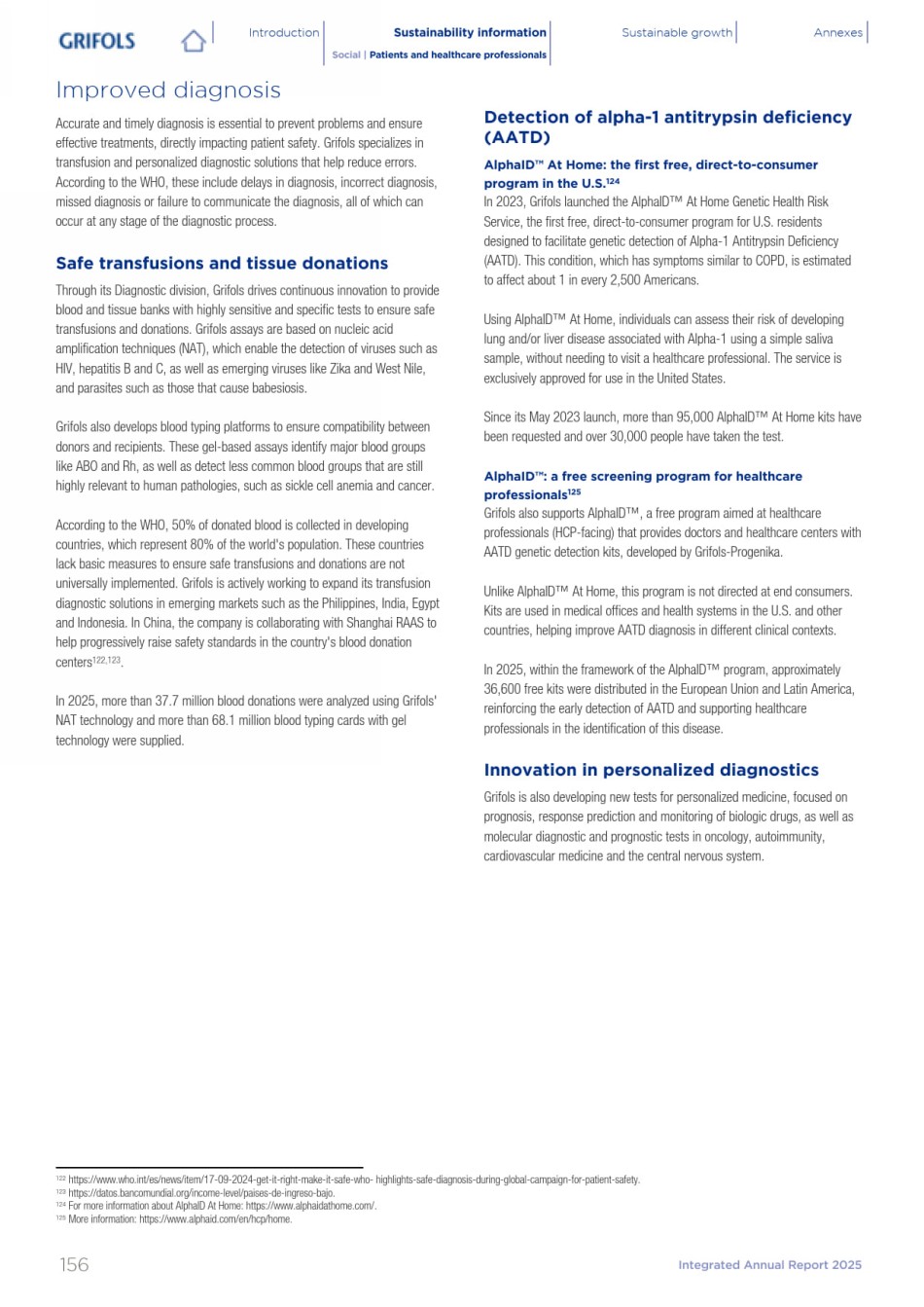 提高诊断准确度及时诊断对于预防问题、确保有效治疗至关重要,直接影响患者安全。Grifols专门研究有助于减少错误的输血和个性化诊断解决方案。世卫组织称,这些包括延误诊断、错误诊断、漏诊或未能传达诊断,所有这些都可能发生在诊断过程的任何阶段。安全输血和组织捐赠通过其诊断部门,Grifols推动持续创新,为血液和组织库提供高度敏感和特定的测试,以确保安全输血和捐赠。Grifols检测基于核酸扩增技术(NAT),能够检测HIV、乙型肝炎和丙型肝炎等病毒,以及寨卡病毒和西尼罗河等新出现的病毒,以及导致巴贝虫病的寄生虫。Grifols还开发了血型平台,以确保捐赠者和接受者之间的兼容性。这些基于凝胶的检测可以识别ABO和RH等主要血型,还可以检测不太常见的血型,这些血型仍然与人类病理高度相关,例如镰状细胞贫血和癌症。世卫组织表示,50%的献血是在发展中国家采集的,这些国家占世界人口的80%。这些国家缺乏确保安全输血和捐赠不被普遍实施的基本措施。Grifols正积极致力于在菲律宾、印度、埃及和印度尼西亚等新兴市场扩展其输血诊断解决方案。在中国,该公司正与上海RAAS合作,帮助逐步提高该国献血中心的安全标准s122,123。2025年,使用Grifols的NAT技术分析献血超过3770万人次,提供超过6810万张使用凝胶技术的血型分型卡。在家中检测α-1抗胰蛋白酶缺乏症(AATD)AlphaID:美国首个免费、直接面向消费者的项目。124在2023年,Grifols推出了AlphaID at Home遗传健康风险服务,这是首个面向美国居民的免费、直接面向消费者的计划,旨在促进Alpha-1抗胰蛋白酶缺乏症(AATD)的基因检测。这种症状与慢阻肺相似的疾病,估计每2,500名美国人中就有1人受到影响。在家中使用AlphaID,个人可以使用简单的唾液样本评估他们患上与Alpha-1相关的肺部和/或肝脏疾病的风险,而无需拜访医疗保健专业人员。该服务专门获准在美国使用。自2023年5月推出以来,已有超过9.5万个AlphaID at Home套件被请求,超过3万人参加了测试。AlphaID:面向医疗保健专业人员的免费筛查计划S125 Grifols还支持AlphaID,这是一项针对医疗保健专业人员(面向HCP)的免费计划,为医生和医疗中心提供AATD基因检测试剂盒,由Grifols-Progenika开发。与AlphaID At Home不同,该计划不针对终端消费者。试剂盒被用于美国和其他国家的医疗办公室和卫生系统,有助于改善不同临床环境下的AATD诊断。2025年,在AlphaID计划框架内,在欧盟和拉丁美洲分发了大约36600个免费试剂盒,加强了对AATD的早期检测,并支持医疗保健专业人员识别这种疾病。个性化诊断的创新Grifols还在开发个性化医疗的新测试,专注于生物药物的预后、反应预测和监测,以及肿瘤学、自身免疫、心血管医学和中枢神经系统的分子诊断和预后测试。简介可持续发展信息可持续增长附件社会|患者和医疗保健专业人员156综合年度报告2025122 https://www.who.int/es/news/item/17-09-2024-get-it-right-make-it-safe-who-highlights-safe-diagnosis-during-global-campaign-for-patient-safety。123 https://datos.bancomundial.org/income-level/paises-de-ingreso-bajo。124更多关于居家AlphaID的信息,请访问:https://www.alphaidathome.com/。125更多信息:https://www.alphaid.com/en/hcp/home。