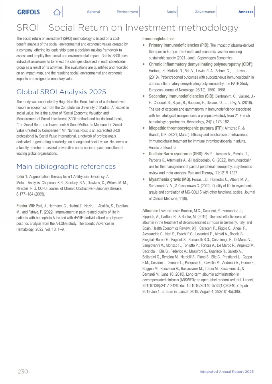 SROI-社会投资回报率方法社会投资回报率(SROI)方法基于对公司创造的社会、环境和经济价值的成本-收益分析,为其领导团队提供一个决策框架,以评估和扩大其社会和环境影响。Grifols的SROI使用个别评估来反映每个利益相关者群体因其活动而观察到的变化。评估被量化并记录在影响地图上,由此产生的社会、环境和经济影响被赋予货币价值。Global SROI Analysis 2025该研究由马德里康普卢滕斯大学经济学荣誉博士学位获得者Hugo Narrillos Roux进行。社会价值专家,著有《社会经济:社会投资的估值与度量(SROI法)及其博士论文《社会投资回报率:衡量企业创造的社会价值的好方法》。Narrillos Roux先生是Social Value International认可的SROI专业人士,这是一个致力于产生关于变革和社会价值的知识的专业人士网络。他在多所大学担任教员,并在领先的全球组织担任社会影响顾问。主要参考书目lpha 1:α 1抗胰蛋白酶缺乏症的增强疗法:a meta □分析。Chapman,K.R.,Stockley,R.A.,Dawkins,C.,Wilkes,M.M.,Navickis,R. J. COPD:慢性阻塞性肺疾病杂志,6:177 – 184(2009)。因子VIII:Pasi,J.,Hermans。C.、Hakimi,Z.、Nazir,J.、Aball é a,S.、Ezzalfani,M.和Fatoye,F.(2022):改善接受rFVIIIFC个体化预防治疗的A型血友病患者的疼痛相关生活质量:来自A-LONG研究的事后分析。血液学的治疗进展。2022,Vol.13:1 – 9。免疫球蛋白:•原发性免疫缺陷(PID):欧洲血浆衍生疗法的影响。确保可持续供应的健康和经济案例(2021,6月)。哥本哈根经济学。•慢性炎症性脱髓鞘多发性神经病(CIDP):Hartung,H.,Mallick,R.,Bril,V.,Lewis,R. A.,Sobue,G.,…Lawo,J.(2019)。患者报告了慢性炎症性脱髓鞘多发性神经病的皮下免疫球蛋白结果:PATH研究。European Journal of Neurology,26(12),1550 – 1558。•继发性免疫缺陷(SID):Benbrahim,O.,Viallard,J.-F.,Choquet,S.,Royer,B.,Bauduer,F.,Decaux,O.,…L é vy,V.(2018)。Octagam和gammanorm在与血液系统恶性肿瘤相关的免疫缺陷中的使用:来自法国21个血液科的前瞻性研究。血液科,24(1),173-182。•特发性血小板减少性紫癜(ITP):Almizraq R. & Branch,D.R.(2021年3月)。静脉注射免疫球蛋白治疗成人免疫性血小板减少症的疗效及机制。血之纪事,6。• Guillain-Barr é综合征(GBS):ZIS P.,Liampas A.,Pozotou T.,Parperis K.,Artemiadis A.,& Hadjigeorgiou G.(2022)。免疫球蛋白在疼痛性周围神经病变治疗中的应用:系统综述及荟萃分析。疼痛与治疗,11:1219-1227。•重症肌无力(MG):Porras L.D.,Homedes C.,Alberti M.A.,Santamaria V.V.,& Casasnovas C.(2022)。重症肌无力患者的生活质量及MG-QOL15与其他功能量表的相关性。临床医学杂志,11(8)。白蛋白:肝硬化:Runken,M.C.,Caraceni,P.,Fernandez,J.,Zipprich,A.,Carlton,R.,& Bunke,M.(2019)。白蛋白在德国、意大利、西班牙治疗失代偿期肝硬化的成本-有效性。卫生经济学评论,9(1)。Caraceni P.,Riggio O.,Angeli P.,Alessandria C.,Neri S.,Foschi F.G.,Levantesi F.,Airoldi A.,Boccia S.,Svegliati-Baroni G.,Fagiuoli S.,Romanelli R.G.,Cozzolongo R.,Di Marco V.,Sangiovanni V.,Morisco F.,Toniutto P.,Tortora A.,De Marco R.,Angelico M.,Cacciola I.,Elia G.,Federico A.,Massironi S.,Guarisco R.,Galioto A.,Ballardini G.,Rendina M.,Nardelli S.,Piano S.,白蛋白长期给药治疗失代偿期肝硬化(ANSWER):一项开放标签随机试验。Lancet,391(10138):2417-2429.doi:10.10 16/S0140-6736(18)30840-7。Epub 2018年6月1日。Erratum in:Lancet。2018年8月4日;392(10145):386。大环境社会治理附件230综合年度报告2025
