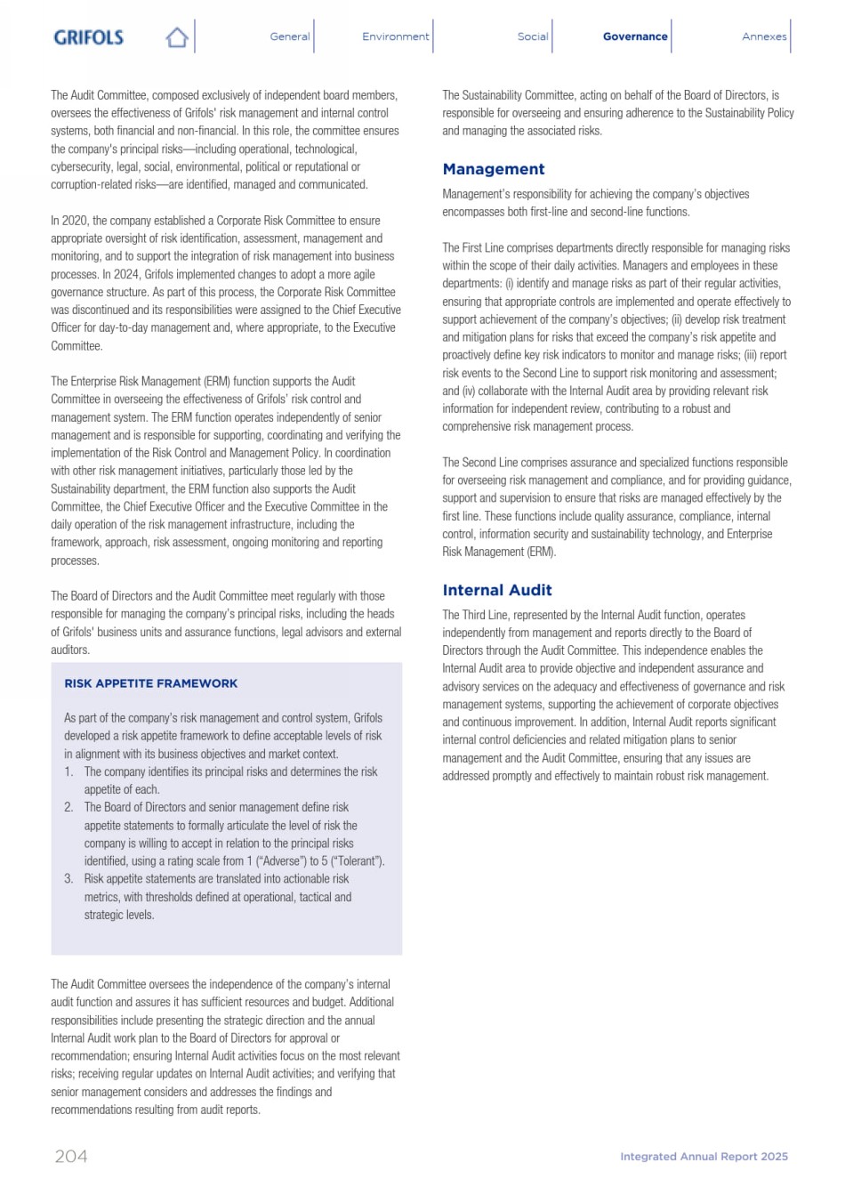 审计委员会完全由独立董事会成员组成,负责监督Grifols的财务和非财务风险管理和内部控制系统的有效性。在这个角色中,委员会确保公司的主要风险——包括运营、技术、网络安全、法律、社会、环境、政治或声誉或腐败相关风险——被识别、管理和沟通。2020年,公司成立了企业风险委员会,以确保对风险识别、评估、管理和监测进行适当监督,并支持将风险管理融入业务流程。2024年,Grifols实施了变革,采用了更敏捷的治理结构。作为这一过程的一部分,公司风险委员会被终止,其职责被分配给首席执行官进行日常管理,并酌情分配给执行委员会。企业风险管理(ERM)职能支持审计委员会监督Grifols风险控制和管理系统的有效性。ERM职能独立于高级管理层运作,负责支持、协调和验证风险控制和管理政策的实施。与其他风险管理举措,特别是由可持续发展部门牵头的风险管理举措相协调,ERM职能还支持审计委员会、首席执行官和执行委员会开展风险管理基础设施的日常运营,包括框架、方法、风险评估、持续监测和报告流程。董事会和审计委员会定期与负责管理公司主要风险的人员举行会议,包括Grifols业务部门和保证职能的负责人、法律顾问和外部审计师。风险偏好框架作为公司风险管控体系的一部分,Grifols开发了一个风险偏好框架,根据其业务目标和市场环境定义可接受的风险水平。1.公司识别其主要风险,并确定各自的风险偏好。2.董事会和高级管理层定义风险偏好陈述,以正式阐明公司愿意接受的与所识别的主要风险相关的风险水平,使用从1(“不良”)到5(“容忍”)的评级表。3.风险偏好声明被转化为可操作的风险指标,在操作、战术和战略层面定义了阈值。审计委员会监督公司内部审计职能的独立性,并确保其拥有充足的资源和预算。额外职责包括将战略方向和年度内部审计工作计划提交董事会批准或建议;确保内部审计活动侧重于最相关的风险;定期收到内部审计活动的最新情况;核实高级管理层是否考虑并处理审计报告产生的调查结果和建议。可持续发展委员会代表董事会,负责监督和确保遵守可持续发展政策并管理相关风险。管理层管理层实现公司目标的责任包括一线和二线职能。一线由直接负责日常活动范围内风险管理的部门组成。这些部门的管理人员和员工:(i)将风险识别和管理作为其常规活动的一部分,确保实施适当的控制措施并有效运作,以支持实现公司的目标;(ii)针对超出公司风险偏好的风险制定风险处理和缓解计划,并主动定义关键风险指标,以监测和管理风险;(iii)向二线报告风险事件,以支持风险监测和评估;(iv)通过提供相关风险信息以供独立审查,与内部审计领域合作,促进稳健和全面的风险管理流程。第二条线由负责监督风险管理和合规,并提供指导、支持和监督的保证和专门职能组成,以确保风险由第一条线有效管理。这些职能包括质量保证、合规、内部控制、信息安全和可持续发展技术以及企业风险管理(ERM)。内部审计三线,以内部审计职能为代表, 独立于管理层运作,并通过审计委员会直接向董事会报告。这种独立性使内部审计领域能够就治理和风险管理系统的充分性和有效性提供客观和独立的保证和咨询服务,支持实现公司目标和持续改进。此外,内部审计向高级管理层和审计委员会报告重大内部控制缺陷和相关缓解计划,确保任何问题都得到及时有效的解决,以保持稳健的风险管理。大环境社会治理附件204综合年度报告2025
