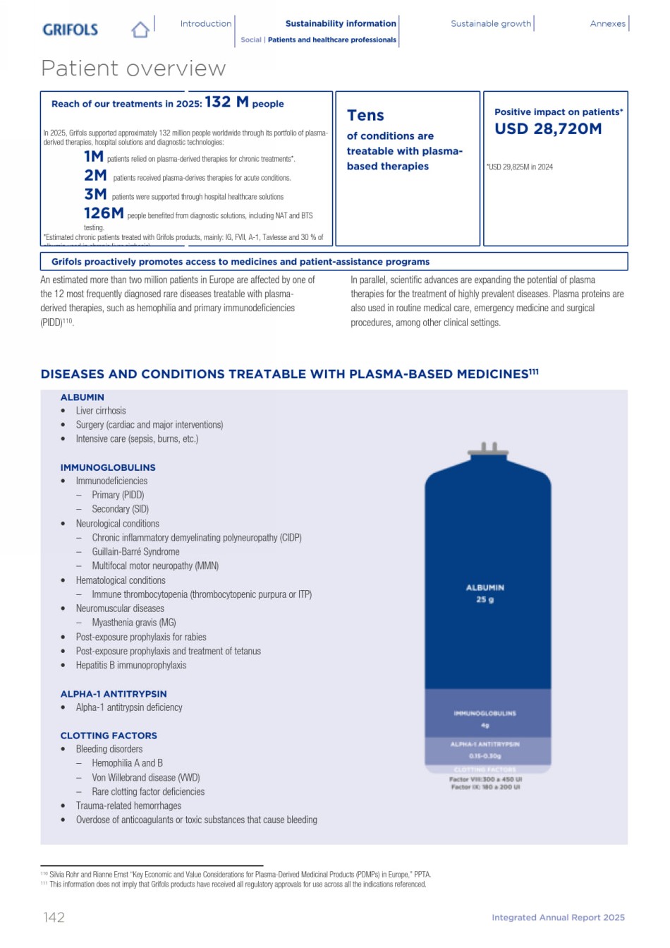 推动具有高影响力的内部举措Xembify®预防继发性免疫缺陷患者感染临床试验评价皮下免疫球蛋白XMIBify的安全性、有效性及药代动力学®用于预防慢性淋巴细胞白血病(CLC)、多发性骨髓瘤(MM)和霍奇金淋巴瘤(HL)合并继发性免疫缺陷(SID)患者的感染。双盲3期临床试验+ 380名参与者70个健康中心Firt t患者于2023年接受治疗·在美国和欧洲开展Alpha-1抗胰蛋白酶治疗肺气肿的临床试验,评估两种静脉注射alpha-1给药方案(60和120mg/kg/周)在因α-1抗胰蛋白酶缺乏症(AATD)导致的肺气肿受试者中的疗效和安全性。SPARTA-双盲3/4期临床试验+ 339名参与者(招募于2023年结束)目前处于患者治疗阶段2026年的结果-27血浆疗法的里程碑和进展• FDA已批准使用辛酸酯纯化/色谱工艺制造RhOD-C超免疫免疫球蛋白。这种免疫球蛋白适用于在携带RH阳性婴儿时出现不相容的RH阴性妈妈。• Prolastin-C,液体制剂,阿根廷上市。适用于治疗α-1抗胰蛋白酶缺乏症(AATD)。阿根廷是美国以外第一个销售这种形式的国家。• FDA批准了Grifols与Selagine合作开发的免疫球蛋白滴眼液的研究性新药(IND)申请。该授权允许公司启动2期临床试验,以评估滴眼液治疗干眼症的安全性、耐受性和有效性。该试验将招募100名患者。干眼症候群影响全球超过1亿人。• FDA已授予IDS患者Gamunex-C的IND批准。有了这项授权,可以开始3期临床试验,以评估Gamunex-C用于预防CLL、MM和HL患者IDS感染的安全性、有效性和药代动力学。该试验将在美国和欧洲的大约30个中心招募50名患者。• FDA已授予Xembify治疗慢性炎症性脱髓鞘多发性神经病(CIDP)的药物识别号(DIN)批准。这一授权使得能够启动一项3期临床试验,以评估Xembify与Gamunex-C在CIDP患者中的安全性和药代动力学。该试验将在美国和欧洲的大约20个中心招募40名患者。•在评估两种α-1 15% AATD方案皮下给药的安全性和耐受性的1/2期研究中,第二个患者队列的招募已经结束。• Flebogamma的2/3期研究报告了积极的结果®-DIF5 %,用于评估脊髓灰质炎后综合征(PPS)患者的安全性和长期疗效。该研究表明,在治疗一年后,与安慰剂相比,身体表现有统计学上的显着改善。据估计,有1200万至2000万小儿麻痹症幸存者有患上PPS的风险。• PRECIOSA 3期临床试验主要结果已公布。试验评价白蛋白(白蛋白®20%)在北美和欧洲14个国家的410名失代偿期肝硬化和腹水患者中。数据显示,与接受标准治疗的患者相比,使用这种血浆衍生药物联合常规药物治疗的患者在三个月时实现了更好的无移植生存期。尽管该试验没有达到其主要终点,但也观察到了总生存期的改善和疾病相关并发症的减少。• SUNSHINE研究,一项IIIB期临床试验,已启动,主要目标是获得欧洲联盟对家庭自我输液Prolastin的授权。该研究包括德国的33名AATD患者。• FDA批准PAS(Pre-Approval Supplement)引入新的柔性无菌袋(Flexibag)中的Gamunex-C演示文稿,以替代当前的玻璃小瓶演示文稿。各开发阶段PLASMA疗法研发项目数量项目数量占比项目数量占比研发预算投入总额100% 87 100%发现20% 174%临床前开发13% 116%临床试验审批流程14% 1227%-I期临床试验1% 10%-II期临床试验2% 27%-III期临床试验10% 920%商业化后研究6% 518% CMC &其他项目48% 4245%简介可持续发展信息可持续增长附件社会|创新在Grifols 164综合年度报告2025