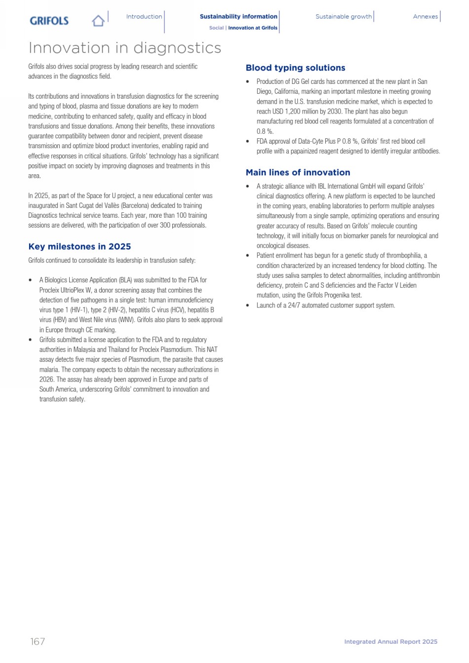 诊断领域的创新Grifols还通过引领诊断领域的研究和科学进步推动社会进步。其在用于血液、血浆和组织捐赠的筛查和分型的输血诊断方面的贡献和创新是现代医学的关键,有助于加强输血和组织捐赠的安全性、质量和有效性。在这些好处中,这些创新保证了捐赠者和接受者之间的兼容性,防止了疾病传播并优化了血液制品库存,从而能够在危急情况下做出快速有效的反应。Grifols的技术通过改善这方面的诊断和治疗,对社会产生了重大的积极影响。2025年,作为Space for U项目的一部分,一个新的教育中心在Sant Cugat del Vall è s(巴塞罗那)落成,专门用于培训诊断技术服务团队。每年提供超过100场培训课程,超过300名专业人士参与。2025年的关键里程碑Grifols继续巩固其在输血安全方面的领导地位:•向FDA提交了Procleix UltrioPlex W的生物制品许可申请(BLA),这是一种供体筛查试验,在单一测试中结合了五种病原体的检测:人类免疫缺陷病毒1型(HIV-1)、2型(HIV-2)、丙型肝炎病毒(HCV)、乙型肝炎病毒(HBV)和西尼罗河病毒(WNV)。Grifols还计划通过CE标志在欧洲寻求批准。• Grifols向FDA以及马来西亚和泰国的监管机构提交了Procleix Plasmodium的许可申请。这项NAT检测检测出五种主要的疟原虫,一种导致疟疾的寄生虫。该公司预计将在2026年获得必要的授权。该检测已在欧洲和南美部分地区获得批准,突显了Grifols对创新和输血安全的承诺。血液分型解决方案• DG Gel卡的生产已在加利福尼亚州圣地亚哥的新工厂开始,标志着满足美国输血药物市场不断增长的需求的重要里程碑,预计到2030年该市场将达到12亿美元。该工厂还开始生产浓度为0.8%的红细胞试剂。• FDA批准Data-Cyte Plus P 0.8%,Grifols的首个红细胞图谱,其中包含一种用于识别不规则抗体的木瓜蛋白化试剂。创新主线•与IBL International GmbH的战略联盟将扩大Grifols的临床诊断产品。预计未来几年将推出一个新平台,使实验室能够从单个样本同时进行多项分析,优化操作并确保结果更加准确。基于Grifols的分子计数技术,它最初将专注于神经和肿瘤疾病的生物标志物面板。•一项关于血栓性嗜好的基因研究的患者入组工作已经开始,这种情况的特点是血液凝结倾向增加。该研究使用唾液样本检测异常,包括抗凝血酶缺乏症、蛋白质C和S缺乏症以及因子V莱顿突变,使用Grifols Progenika测试。•推出24/7全天候自动化客户支持系统。导言可持续发展信息可持续增长附件社会|创新在Grifols 167综合年度报告2025