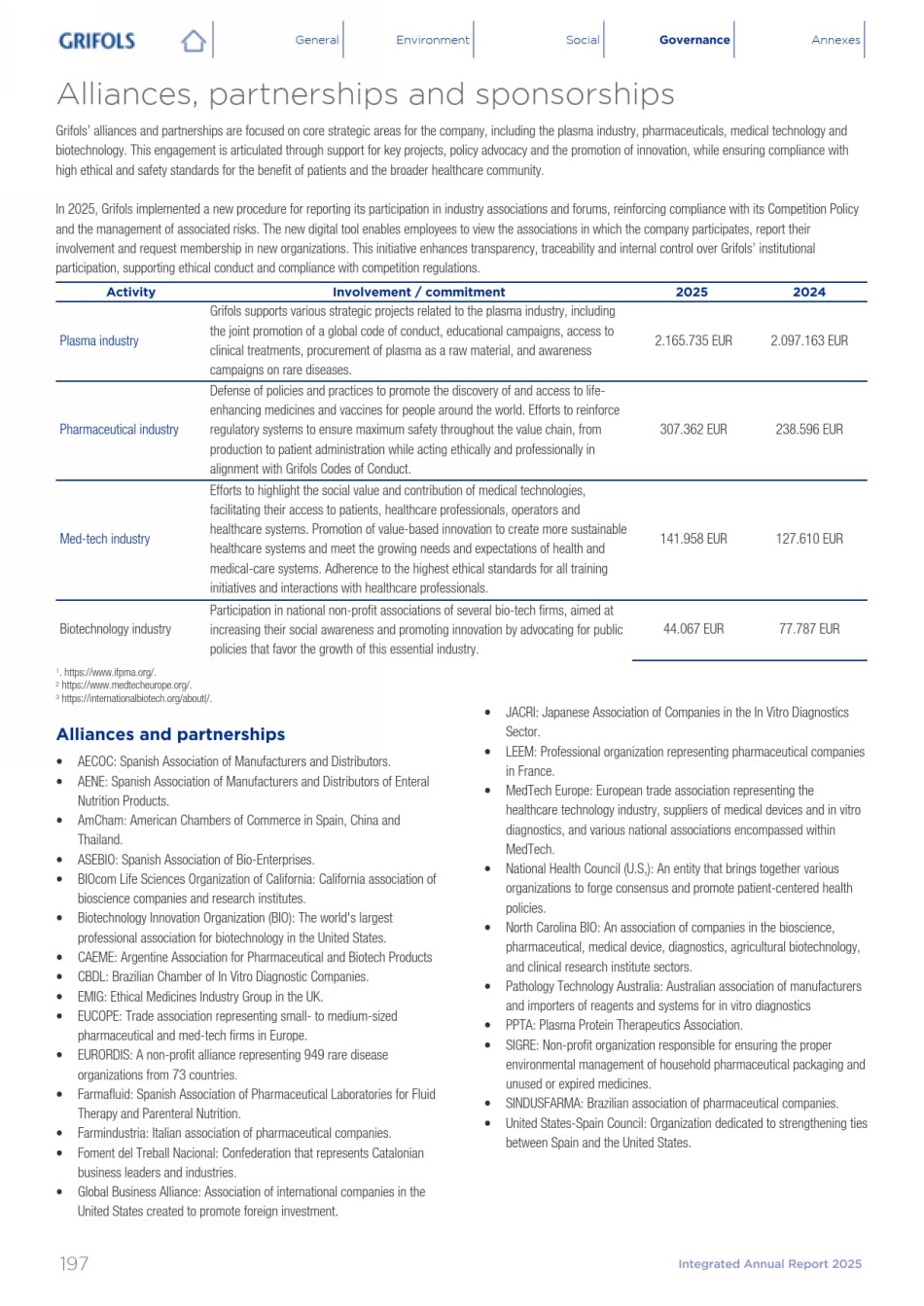 联盟、伙伴关系和赞助Grifols的联盟和伙伴关系专注于公司的核心战略领域,包括等离子行业、制药行业、医疗技术和生物技术。这种参与是通过对关键项目的支持、政策宣传和促进innovati on来阐明的,同时确保遵守高道德和安全标准,以造福于患者和更广泛的医疗保健界。2025年,Grifols实施了报告其参加行业协会和论坛情况的新程序,通过其竞争政策和相关风险的管理加强了COMPL iance。新的数字工具使员工能够查看公司预期的协会,报告他们的参与情况,并请求成为新组织的成员。这一举措增强了Grifols机构参与的透明度、可追溯性和内部缺陷,支持道德操守和遵守竞争法规。活动参与/承诺20252024血浆行业Grifols支持与血浆行业相关的各种战略项目,包括联合推广全球行为准则、教育运动、获得临床治疗、采购血浆作为原材料以及关于罕见病的宣传运动。2.165.7 35欧元2.09 7.16 3欧元制药行业捍卫政策和做法,以促进世界各地人民发现和获得增强生命的药物和疫苗。努力加强监管系统,以确保从生产到患者管理的整个价值链的最大安全性,同时按照符合Grifols行为准则的道德和专业行为。307.362欧元238.596欧元医疗技术行业努力突出医疗技术的社会价值和贡献,便利他们接触患者、医疗保健专业人员、操作员和医疗保健系统。推动基于价值的创新,以创建更可持续的医疗保健系统,满足健康和医疗保健系统日益增长的需求和期望。在所有培训举措和与医疗保健专业人员的互动中遵守最高道德标准。141.958欧元127.6 10欧元生物技术行业参与几家生物技术公司的国家非营利协会,旨在通过倡导有利于这一重要行业增长的公共政策来提高他们的社会意识并促进创新。44.067欧元77.7 87欧元1. https://www.ifpma.org/。2 https://www.medtecheeurope.org/。3 https://internationalbiotech.org/about(/。联盟和伙伴关系• AECOC:西班牙制造商和分销商协会。• AENE:西班牙肠内营养产品制造商和分销商协会。•美国商会:西班牙、中国和泰国的美国商会。• ASEBIO:西班牙生物企业协会。•加州生物科学生命科学组织:加州生物科学公司和研究机构协会。•生物技术创新组织(BIO):美国全球最大的生物技术专业协会。• CAEME:阿根廷药品和生物技术产品协会• CBDL:巴西体外诊断公司商会。• EMIG:英国Ethical Medicines Industry Group。• EUCOPE:代表欧洲中小型制药和医疗技术公司的贸易协会。• EURORDIS:代表来自73个国家的949个罕见病组织的非营利联盟。• FarmaFluid:西班牙液体疗法和肠外营养药物实验室协会。• FarmIndustria:意大利制药公司协会。• Foment del Treball Nacional:代表加泰罗尼亚商业领袖和行业的联合会。•全球商业联盟:为促进外国投资而创建的美国国际公司协会。• JACRI:日本体外诊断领域公司协会。• LEEM:代表法国制药公司的专业组织。• MedTech Europe:代表医疗保健技术行业、医疗设备和体外诊断供应商的欧洲贸易协会,以及MedTech内部包含的各种国家协会。• National Health委员会(美国,):一个汇集各种组织以达成共识并促进以患者为中心的健康政策的实体。•北卡罗来纳州生物技术:生物科学、制药、医疗设备、诊断、农业生物技术领域的公司协会, 和临床研究机构部门。• Pathology Technology Australia:澳大利亚体外诊断试剂和系统制造商和进口商协会• PPTA:血浆蛋白治疗协会。• SIGREE:负责确保家庭药品包装和未使用或过期药品适当环境管理的非营利组织。• SINDUSFARMA:巴西制药公司协会。•美国-西班牙理事会:致力于加强西班牙与美国关系的组织。大环境社会治理附件197综合年度报告2025