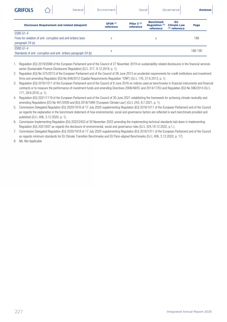 ESRS G1-4项违反反腐败和反贿赂法的罚款第24(a)x188 ESRS G1-4项反腐败和反贿赂标准第24(b)x188-190项披露要求和相关数据点SFDR(1)参考支柱3(2)参考基准条例(3)参考欧盟气候法(4)参考第1页。欧洲议会和理事会2019年11月27日关于金融服务部门可持续发展相关披露的法规(EU)2019/2088(Sustainable Finance Disclosures Regulation)(OJ L 317,9.1 2.2019,p.1)。2.欧洲议会和理事会2013年6月26日关于对cred it机构和投资公司的审慎要求的(EU)第575/2013号条例和修订第648/2012号条例(EU)(资本要求条例“CRR”)(OJ L 176,27.6.2013,第1页)。3.欧洲议会和理事会2016年6月8日关于在金融社会工具和金融合同中用作基准或用于衡量投资基金绩效的指数的条例(EU)2016/1011和修订指令2008/48/EC和2014/17/EU和条例(EU)No 596/2014(OJ L 171,29.6.2016,p. 1)。4.欧洲议会和理事会2021年6月30日的(EU)2021/1119号条例确立了实现气候中和的框架,并修订了(EC)第401/2009号和(EU)2018/1999号条例(‘欧洲气候法’)(OJ L 243,9.7.2021,第1页)。5.欧盟委员会2020年7月17日授权条例(EU)2020/1816补充欧洲议会和理事会关于基准声明中关于环境、社会和治理因素如何反映在提供和发布的EA ch基准中的解释(OJ L 406,3.1 2.2020,第1页)。6.2022年11月30日委员会实施条例(EU)2022/2453修订实施条例(EU)2021/637中关于环境、社会和治理风险披露的实施技术标准(OJ L 324,19.1 2.2022,p.1.)。7.欧盟委员会2020年7月17日授权条例(EU)2020/1818补充欧洲议会和理事会关于欧盟气候转型基准和欧盟巴黎一致基准最低标准的条例(EU)2016/1011(OJ L 406,3.1 2.2020,第17页)。8.NA:不适用大环境社会治理附件227综合年报2025
