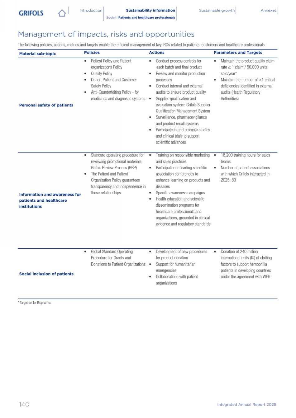 影响、风险和机遇的管理以下政策、行动、指标和目标使Grifols能够高效和有效地管理与其业务管道相关的关键材料IR O t140,141。企业文化•行为准则• Grifols高管的Code of Ethics •质量政策•人权政策•风险控制和管理政策•预防犯罪政策•竞争政策•董事会薪酬政策•美国的透明度政策•可持续发展政策•证券市场相关事项的内部行为规则•沟通政策以及与股东的互动,机构投资者和代理顾问•税务合规和良好做法政策•关联方交易政策•利益冲突政策•追回政策•礼品和款待政策•人权尽职调查•全球合规方案•新员工行为准则培训•年度员工行为准则培训•年度员工签署公司人权政策•全球反腐败方案•对礼品的控制,Grifols Agenda 2030下的招待和赞助•将Biopharma索赔比率维持在≤ 1/50,000*•将外部审计(监管卫生当局)确定的关键缺陷保持在1以下保护举报人• Grifols道德准则方案• Grifols道德准则方案•确保每年100%的员工完成强制性Grifols道德准则培训,包括保密和不报复原则•确保通过Grifols道德准则收到的投诉100%得到处理,按照内部程序并在规定时限内调查解决动物福利•动物福利政策•在所有涉及使用动物的研发活动中应用动物福利政策•在实验程序中实施3R原则(替换、减少和细化)•通过认可供应商的资格认证,确保在涉及使用动物的研发活动中遵守动物福利政策。材料子主题政策行动指标和目标一般环境社会治理附件183综合年度报告2025140有关政策的更多信息和详细信息,请访问Grifo ls网站的“企业法规和政策”部分。141更多详情和查阅人权尽职调查报告和现代奴隶制声明:www.grifols.com。