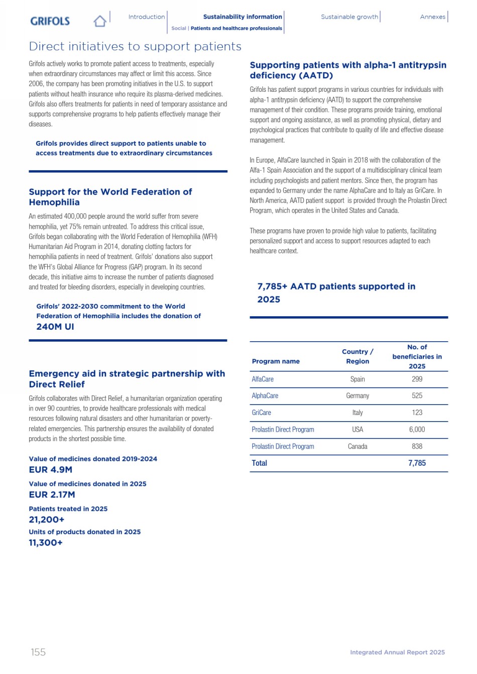 支持患者的直接举措Grifols积极努力促进患者获得治疗,特别是在特殊情况可能影响或限制这种获得的情况下。自2006年以来,该公司一直在美国推动举措,以支持需要其血浆衍生药物的无医疗保险患者。Grifols还为需要临时援助的患者提供治疗,并支持帮助患者有效管理疾病的综合项目。支持世界血友病联合会全球估计有40万人患有严重的血友病,但75%的人仍未得到治疗。为了解决这一关键问题,Grifols于2014年开始与世界血友病联合会(WFH)人道主义援助计划合作,为需要治疗的血友病患者捐赠凝血因子。Grifols的捐款还支持WFH的全球进步联盟(GAP)计划。在第二个十年,这一倡议旨在增加出血性疾病诊断和治疗的患者数量,特别是在发展中国家。Grifols对世界血友病联合会2022-2030年的承诺包括与Direct Relief建立战略合作伙伴关系捐赠2.4亿UI紧急援助Grifols与Direct Relief合作,后者是一家在90多个国家开展业务的人道主义组织,旨在为医疗保健专业人员提供自然灾害和其他人道主义或与贫困相关的紧急情况后的医疗资源。这种伙伴关系确保在尽可能短的时间内获得捐赠的产品。2019-2024年捐赠的药品价值490万欧元2025年捐赠的药品价值217万欧元2025年治疗的患者21,200 +单位2025年捐赠的产品11,300 +支持α-1抗胰蛋白酶缺乏症(AATD)患者Grifols在各国为α-1抗胰蛋白酶缺乏症(AATD)患者提供患者支持计划,以支持对其病情的综合管理。这些项目提供培训、情感支持和持续援助,以及促进有助于提高生活质量和有效疾病管理的身体、饮食和心理实践。在欧洲,AlfaCare于2018年在西班牙推出,得到了Alfa-1西班牙协会的合作以及包括心理学家和患者导师在内的多学科临床团队的支持。此后,该项目以AlphaCare的名称扩展到德国,并以GriCare的名称扩展到意大利。在北美,AATD患者支持是通过Prolastin Direct计划提供的,该计划在美国和加拿大开展业务。事实证明,这些计划为患者提供了很高的价值,促进了个性化支持和获得适应每种医疗保健环境的支持资源。2025年支持的7,785 + AATD患者计划名称国家/地区2025年受益人数量AlfaCare西班牙299 AlphaCare德国525 GriCare意大利123 Prolastin Direct Program美国6,000 Prolastin Direct Program加拿大838总计7,785简介可持续性信息可持续增长附件社会|患者和医疗保健专业人员155综合年度报告2025 Grifols为因特殊情况无法获得治疗的患者提供直接支持