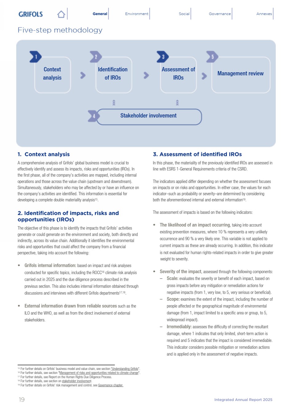 可持续发展治理Grifols近年来在将可持续发展融入其商业模式以放大其积极影响和价值创造方面取得了重要进展。该公司对可持续发展的承诺是在最高组织层面推动的,并嵌入其公司治理中。Grifols董事会于2020年成立了可持续发展委员会,以确保遵守与ESG相关的原则和承诺,以及公司文化与总体宗旨和价值观之间的一致性。其监督包括维护利益相关者透明度政策,例如财务和非财务披露s 138。一般情况下,相关材料先由可持续发展、沟通和声誉委员会审核,然后再与董事会共享。其中包括关于因对组织有直接影响而需要批准或评估的关键可持续发展政策的演讲;年度ESG报告;全球趋势和新监管任务的更新;以及双重重要性等战略主题。此外,委员会还负责定期审查重要的ESG IRO(影响、风险和机会),并确保在公司治理和内部控制框架内适当识别和记录这些信息。有关Grifols在可持续发展指数方面的得分和排名以及从ESG角度对其市场看法的信息也将提交给董事会。这种内容体使公司能够做出明智和连贯的决策,准确地反映其现实和环境。与CEO共享信息,以确保Grifols的可持续发展战略与公司目标完全一致。2025年7月,可持续发展委员会更名为可持续发展、传播和声誉委员会。可持续发展指导委员会是一个全球性的多学科机构,由投资者关系和可持续发展(IR & S)部门协调,其副总裁向可持续发展、沟通和声誉委员会报告。该委员会成立于2021年,每年至少举行一次会议,以促进正在进行的对话,确定和确定与Grifols战略计划一致的目标,监督其实施,并协调非财务和公司可持续发展信息的整合和报告。在可持续发展指导委员会的主持下,投资者关系与管理部门领导ESG相关培训和参与举措,并评估全球趋势和Grifols的ESG战略,以巩固其作为世界上最具可持续性的公司之一的地位。更具技术性和细节性的是,指导委员会会议充当了ESG事务涉及的所有组织领域的桥梁。可持续发展管理机构可持续发展是Grifols公司治理的一个关键优先事项,它建立了确保遵守、协调、实施和审查组织目标的机制。通过这些努力,Grifols努力成长为一家负责任、透明的公司,致力于为多元化的利益相关者提供服务。Grifols的治理、管理和监督机构拥有必要的技能和经验,以确保有效制定应对公司实质性影响、风险和机遇的战略和措施。董事会批准公司的可持续发展政策和战略指导方针,而其专门委员会——具体而言,可持续发展、沟通和声誉委员会、审计委员会以及任命和薪酬委员会——监督ESG绩效,定期评估组织是否具备适当的技术能力和知识,或者是否应通过有针对性的培训计划来加强这些能力和知识。可持续发展指导委员会监测目标、指标和取得的进展,确保公司承诺与Grifols 2030议程保持一致。业务领域和企业职能负责实施已批准的战略和行动计划,并确保将其有效纳入日常管理。通过这一结构,Grifols保持了与国际标准(ESRS GOV-1和GOV-2)一致的坚实、一体化的治理框架,确保了信息的可追溯性、ESG绩效的有效监督以及可持续的长期价值的创造。批准董事会监督可持续发展、沟通和声誉委员会审计委员会任命和薪酬委员会跟进可持续发展指导委员会实施业务领域和企业支持领域大环境社会治理附件177综合年度报告2025138访问可持续发展、沟通和声誉委员会的规定。