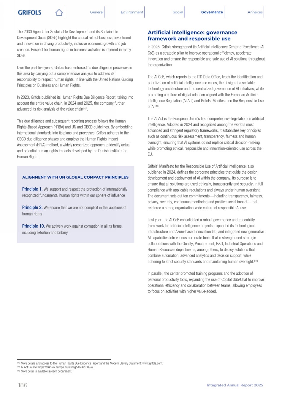 2030年可持续发展议程及其可持续发展目标(SDGs)强调了企业、投资和创新在推动生产力、包容性经济增长和创造就业方面的关键作用。在商业活动中尊重人权是许多可持续发展目标所固有的。在过去五年中,Grifols根据《联合国工商业与人权指导原则》开展全面分析,以解决其尊重人权的责任,从而加强了该领域的尽职调查进程。2023年,Grifols发布了人权尽职调查报告,考虑到了整个价值链。在2024和2025年,公司进一步推进了对价值chai n147的风险分析。这一尽职调查和随后的报告流程遵循基于人权的方法(HRBA)以及联合国和经合组织的指导方针。通过将国际标准嵌入其计划和流程,Grifols遵守经合组织的尽职调查阶段,并采用人权影响评估(HRIA)方法,这是一种广泛认可的方法,用于确定由丹麦人权研究所开发的实际和潜在的人权影响。与联合国全球契约原则原则保持一致原则1。我们支持并尊重在我们的势力范围原则2内保护国际公认的基本人权。我们确保我们不是侵犯人权原则10的同谋。我们积极打击一切形式的腐败,包括敲诈勒索和贿赂人工智能:治理框架和负责任的使用2025年,Grifols加强了其人工智能卓越中心(AI CoE)作为战略支柱,以提高运营效率、加速创新并确保在整个组织内以负责任和安全的方式使用AI解决方案。AI CoE向ITD数据办公室报告,领导识别和确定人工智能用例的优先顺序、设计可扩展的技术架构和集中治理人工智能举措,同时促进与欧洲人工智能法规(AI法案)和Grifols关于负责任使用A I 148的宣言相一致的数字采用文化。人工智能法案是欧盟首部关于人工智能的综合性立法。该法案于2024年通过,在全球最先进、最严格的监管框架中获得认可,确立了持续风险评估、透明度、公平和人为监督等关键原则,确保人工智能系统不会取代关键决策,同时在整个欧盟范围内促进以道德、负责任和创新为导向的使用。Grifols的《负责任地使用人工智能宣言》也于2024年发布,其中定义了指导公司内部AI设计、开发和部署的企业原则。其目的是确保所有解决方案的使用符合道德、透明和安全,完全符合适用的法规,并始终处于人为监督之下。该文件提出了十项承诺——包括透明度、公平、隐私、安全、持续监控和积极的社会影响——这些承诺加强了强大的全组织负责任的人工智能使用文化。去年,AI CoE巩固了强大的人工智能项目治理和可追溯性框架,扩展了其技术基础设施和基于Azure的创新实验室,并将新的生成AI能力整合到各种企业工具中。它还加强了与质量、采购、研发、工业运营和人力资源部门等的战略协作,以部署结合自动化、高级分析和决策支持的解决方案,同时遵守严格的安全标准并保持人工监督。149同时,该中心还推动了培训计划和个人生产力工具的采用,扩大了Copilot 365/Chat的使用范围,以提高运营效率和团队之间的协作,使员工能够专注于附加值更高的活动。一般环境社会治理附件186综合年度报告2025147更多详情和查阅人权尽职调查报告和现代奴隶制声明:www.grifols.com。148 AI法案来源:https://eur-lex.europa.eu/eli/reg/2024/1689/oj。149每个部门都有更多细节。