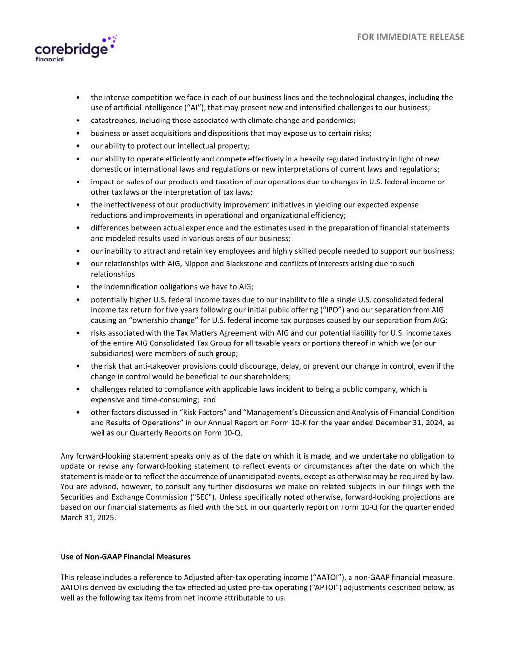 立即发布•我们在每个业务领域面临的激烈竞争以及技术变革,包括使用人工智能(“AI”),可能会给我们的业务带来新的和加剧的挑战;•灾难,包括与气候变化和流行病有关的那些;•企业或资产的收购和处置这可能会使我们面临某些风险;•我们保护知识产权的能力;•根据新的国内或国际法律法规或对现行法律法规的新解释,我们在受到严格监管的行业中高效运营和有效竞争的能力;•由于美国联邦收入或其他税法或税法解释的变化,对我们产品的销售和我们运营的税收产生影响;•我们的生产力提高举措在产生我们预期的费用削减和运营改善方面没有成效和组织效率;•实际经验与编制财务报表时使用的估计以及我们业务各个领域使用的建模结果之间的差异;•我们无法吸引和留住支持我们业务所需的关键员工和高技能人员;•我们与AIG的关系,Nippon和Blackstone以及由于此类关系而产生的利益冲突•我们对AIG的赔偿义务;•由于我们在首次公开募股(“IPO”)后的五年内无法提交一份单一的美国综合联邦所得税申报表,以及我们与AIG的分离导致由于我们与AIG的分离而导致的美国联邦所得税“所有权变更”,因此可能会导致更高的美国联邦所得税;•与AIG的税务事项协议相关的风险以及我们在我们(或我们的子公司)作为该集团成员的所有纳税年度或其部分对整个AIG合并税务集团的美国所得税的潜在责任;•反收购条款可能阻止、延迟或阻止我们控制权变更的风险,即使控制权变更将有利于我们的股东;•与作为一家上市公司所发生的适用法律的遵守相关的挑战,这是昂贵和耗时的;•我们在截至2024年12月31日止年度的10-K表格年度报告中的“风险因素”和“管理层对财务状况和运营结果的讨论和分析”中讨论的其他因素,以及我们在10-Q表格上的季度报告。任何前瞻性陈述仅在作出之日起生效,我们不承担更新或修改任何前瞻性陈述以反映作出陈述之日之后的事件或情况或反映意外事件发生的义务,除非法律另有规定。不过,请查阅我们在提交给美国证券交易委员会(“SEC”)的文件中就相关主题所做的任何进一步披露。除非另有特别说明,前瞻性预测基于我们在截至2025年3月31日的季度10-Q表格季度报告中向SEC提交的财务报表。非GAAP财务指标的使用本新闻稿提及调整后税后营业收入(“AATOI”),这是一种非GAAP财务指标。AATOI是通过从归属于我们的净收入中剔除下文所述的经调整的税前经营(“APTOI”)调整以及以下税项得出的: