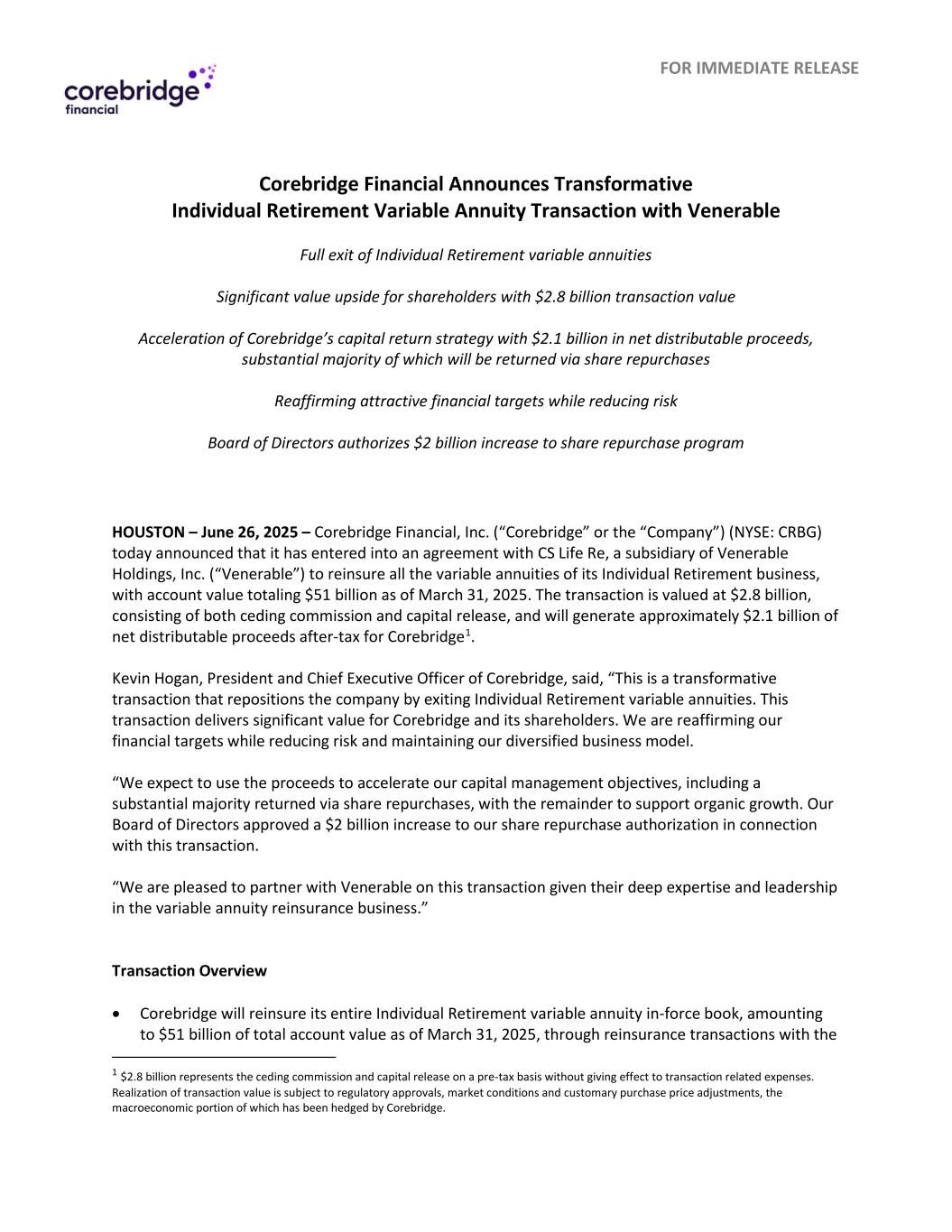 立即发布Corebridge Financial宣布进行变革性的个人退休可变年金交易,可敬地完全退出个人退休可变年金,28亿美元的交易价值为股东带来显着的价值上升空间Corebridge的资本回报战略加速推进,可分配净收益为21亿美元,其中大部分将通过股票回购方式返还,重申有吸引力的财务目标,同时降低风险董事会授权将股票回购计划增加20亿美元休斯顿– 2025年6月26日– Corebridge Financial,Inc.(“Corebridge”或“公司”)(纽约证券交易所代码:CRBG)今天宣布,已与Venerable Holdings,Inc.(“Venerable”)的子公司CS Life Re达成协议,为其个人退休业务的所有可变年金进行再保险,截至2025年3月31日,账户价值总计510亿美元。该交易价值28亿美元,包括割让佣金和资本释放,将为Corebridge1带来约21亿美元的税后可分配净收益。Corebridge总裁兼首席执行官Kevin Hogan表示:“这是一项变革性交易,通过退出个人退休可变年金来重新定位公司。这笔交易为Corebridge及其股东带来了重大价值。我们正在重申我们的财务目标,同时降低风险并保持我们多元化的业务模式。“我们预计将把所得款项用于加速我们的资本管理目标,包括通过股票回购返还的大部分资金,其余资金用于支持有机增长。我们的董事会批准了与此次交易相关的20亿美元的股票回购授权。“鉴于Venerable在变额年金再保险业务方面的深厚专业知识和领导地位,我们很高兴与他们在这笔交易上合作。”交易概览• Corebridge将通过再保险交易为其全部个人退休可变年金有效账簿进行再保险,截至2025年3月31日,账户总价值为510亿美元,其中1美元28亿代表在税前基础上的分出佣金和资本释放,不影响交易相关费用。交易价值的实现取决于监管机构的批准、市场条件和惯常的购买价格调整,其中的宏观经济部分已被Corebridge对冲。