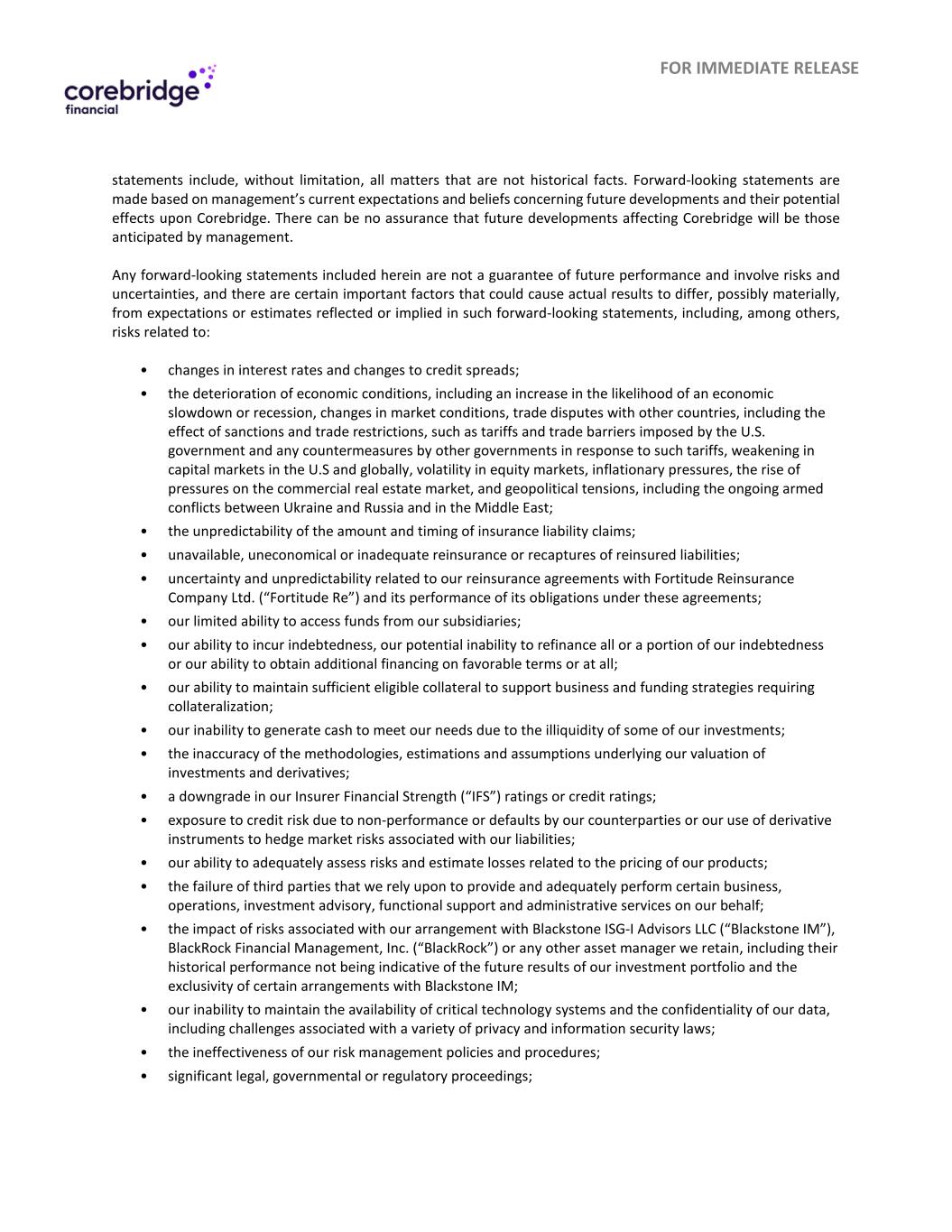 For immediate release statements include,but not limited,all matters that are not historical facts。前瞻性陈述是基于管理层目前对未来发展及其对Corebridge的潜在影响的预期和信念做出的。无法保证影响Corebridge的未来发展将是管理层预期的发展。本文所包含的任何前瞻性陈述都不是对未来业绩的保证,并且涉及风险和不确定性,并且存在某些重要因素,可能导致实际结果与此类前瞻性陈述中反映或暗示的预期或估计存在重大差异,其中包括与以下相关的风险:•利率变化和信用利差变化;•经济状况恶化,包括经济放缓或衰退的可能性增加、市场状况变化、与其他国家的贸易争端,包括制裁和贸易限制的影响,例如美国政府施加的关税和贸易壁垒以及其他国家政府针对此类关税采取的任何反制措施,美国和全球资本市场走弱,股票市场波动,通胀压力,商业房地产市场压力上升,地缘政治紧张局势,包括乌克兰和俄罗斯之间以及中东地区持续的武装冲突;•保险责任索赔的金额和时间的不可预测性;•无法获得,不经济或不充分的再保险或重新获得再保险负债;•与我们与Fortitude Reinsurance Company Ltd.(“Fortitude Re”)的再保险协议及其在这些协议下履行义务相关的不确定性和不可预测性;•我们从子公司获得资金的能力有限;•我们承担债务的能力,我们可能无法为我们的全部或部分债务再融资,或者我们有能力以优惠条件或根本无法获得额外融资;•我们有能力维持足够的合格抵押品,以支持需要抵押的业务和融资战略;•由于我们的一些投资缺乏流动性,我们无法产生现金来满足我们的需求;•方法不准确,我们对投资和衍生品估值所依据的估计和假设;•我们的保险公司财务实力(“IFS”)评级或信用评级被下调;•由于我们的交易对手不履约或违约或我们使用衍生工具来对冲与我们的负债相关的市场风险而面临信用风险;•我们充分评估与我们的产品定价相关的风险和估计损失的能力;•我们所依赖的第三方未能提供并充分履行某些业务、运营、投资咨询,代表我们提供职能支持和行政服务;•我们与Blackstone ISG-I Advisors LLC(“Blackstone IM”)、贝莱德 Financial Management,Inc.(“贝莱德”)或我们保留的任何其他资产管理公司的安排相关的风险的影响,包括它们的历史业绩不代表我们投资组合的未来结果以及与Blackstone IM的某些安排的排他性;•我们无法保持关键技术系统的可用性和我们数据的机密性,包括与各种隐私和信息安全法相关的挑战;•我们的风险管理政策和程序无效;•重大的法律、政府或监管程序;