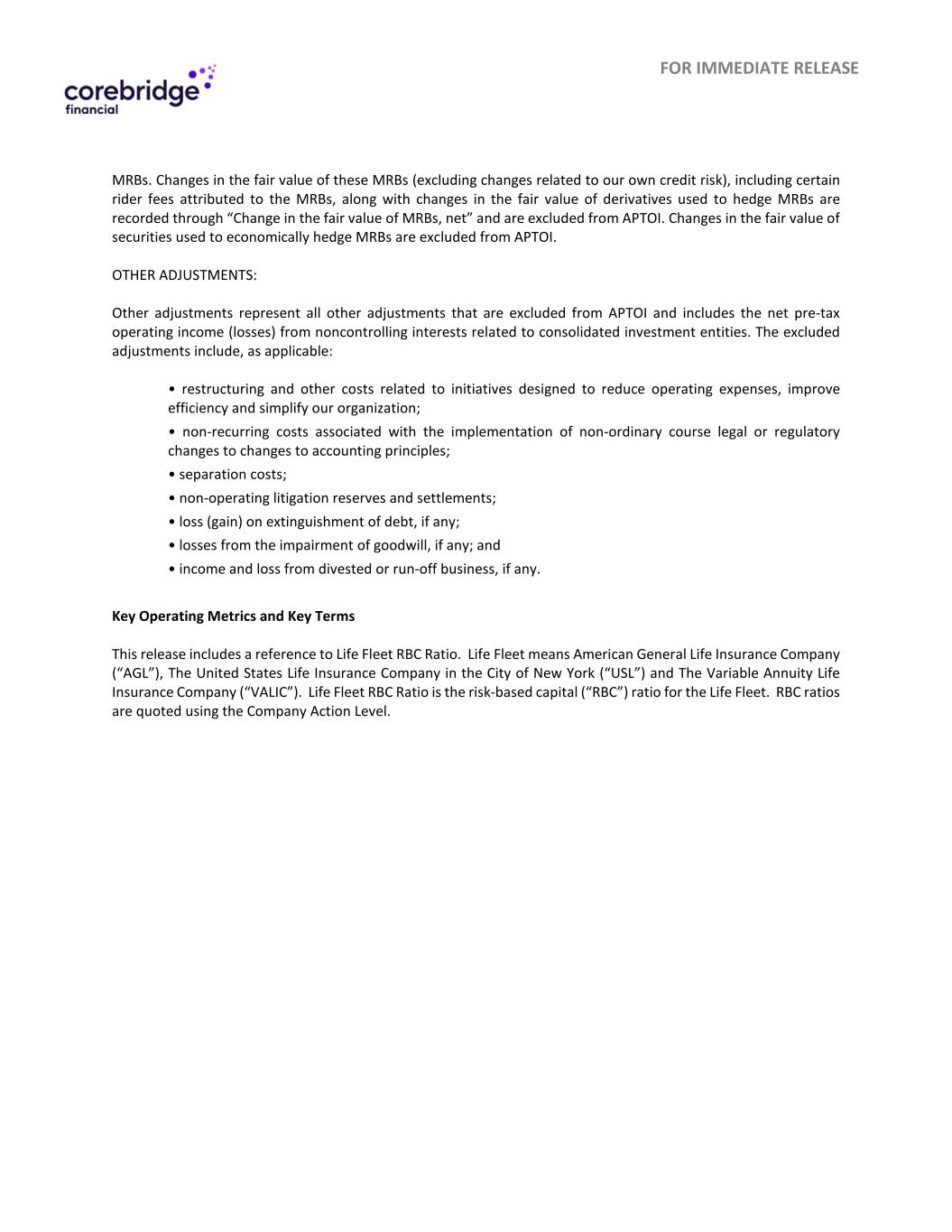 用于立即发布MRB。这些MRB的公允价值变动(不包括与我们自身信用风险相关的变动),包括归属于MRB的某些骑手费用,以及用于对冲MRB的衍生工具的公允价值变动通过“MRB公允价值变动,净额”记录,不包括在APTOI中。用于对MRB进行经济对冲的证券的公允价值变动不计入APTOI。其他调整:其他调整是指不包括在APTOI中的所有其他调整,包括来自与合并投资实体相关的非控制性权益的税前净营业收入(亏损)。被排除的调整酌情包括:•与旨在减少运营费用、提高效率和简化我们组织的举措相关的重组和其他成本;•与对会计原则变更实施非正常课程法律或监管变更相关的非经常性成本;•离职成本;•非经营性诉讼准备金和和解;•债务清偿的损失(收益)(如有);•商誉减值损失(如有);•剥离或流失业务的收入和损失(如有)。关键运营指标和关键术语本新闻稿包含对生命车队RBC比率的参考。Life Fleet是指美国普通人寿保险公司(“AGL”)、美国纽约市人寿保险公司(“USL”)和可变年金人寿保险公司(“VALIC”)。Life Fleet RBC Ratio是指Life Fleet的基于风险的资本(“RBC”)比率。加拿大皇家银行的比率是使用公司行动水平来报价的。