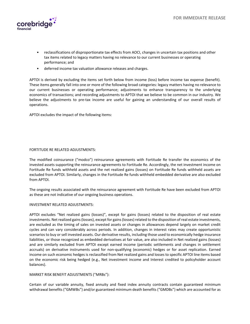 立即发布•从AOCI重新分类不成比例的税收影响、不确定税收状况的变化以及与与我们当前业务或经营业绩无关的遗留事项相关的其他税收项目;以及•递延所得税估值备抵发布和收费。APTOI是通过从所得税费用(收益)前的收入(损失)中排除下列项目得出的。这些项目通常属于以下一个或多个大类:与我们当前业务或经营业绩无关的遗留事项;为提高交易基本经济性的透明度而进行的调整;以及记录我们认为在我们行业中常见的对APTOI的调整。我们认为,对税前收入的调整有助于了解我们的整体经营业绩。APTOI不包括以下项目的影响:FORTITUDE RELATED Adjustments:与Fortitude REE签订的经修改的共同保险(“MODCO”)再保险协议将支持再保险协议的投资资产的经济性转移给Fortitude REE。据此,对Fortitude Re基金扣留资产的净投资收益和对Fortitude Re基金扣留资产的已实现净收益(损失)不计入APTOI。同样,PTOI也排除了Fortitude REF基金扣款嵌入衍生工具的变动。与Fortitude Re的再保险协议相关的持续结果已被排除在APTOI之外,因为这些结果并不代表我们正在进行的业务运营。投资相关调整:APTOI不包括“已实现净收益(损失)”,但与处置房地产投资相关的收益(损失)除外。除与处置房地产投资相关的收益(损失)外,已实现净收益(损失)被排除在外,因为出售投资资产的时间或备抵的变化在很大程度上取决于市场信贷周期,并且在不同时期可能有很大差异。此外,利率的变化可能会创造出买入或卖出投资资产的机会性情景。我们的衍生结果,包括那些用于对保险负债进行经济对冲的结果,或那些以公允价值确认为嵌入衍生工具的结果,也包括在已实现净收益(损失)中,并且同样不包括在APTOI中,但用于不合格(经济)对冲或资产复制的衍生工具的已赚取收入(定期结算和结算应计变动)除外。根据被对冲的经济风险(例如,净投资收入和计入保单持有人账户余额的利息),此类经济对冲的赚取收入从已实现的净损益重新分类到特定的APTOI项目。市场风险福利调整(“MRB”):我们的某些可变年金、固定年金和固定指数年金合同包含保证最低提款福利(“GMWB”)和/或保证最低死亡抚恤金(“GMDB”),它们被记为