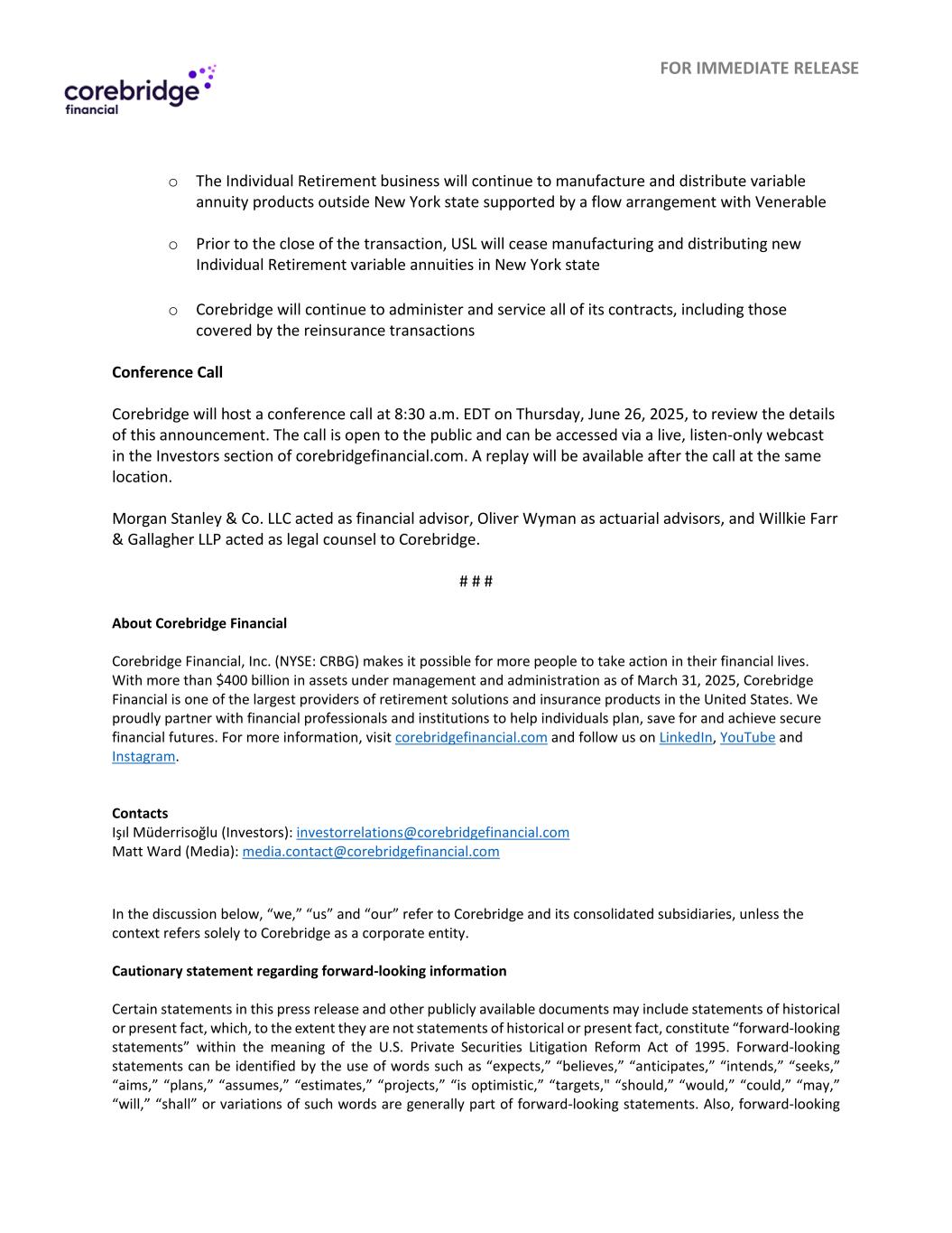 立即发布o个人退休业务将继续在纽约州境外制造和分销由与Venerable o的流动安排支持的可变年金产品在交易结束前,USL将停止在纽约州制造和分销新的个人退休可变年金o Corebridge将继续管理和服务其所有合同,包括再保险交易电话会议涵盖的合同,Corebridge将于美国东部时间2025年6月26日(星期四)上午8:30召开电话会议,以审查本公告的细节。该电话向公众开放,可通过corebridgefinancial.com投资者部分的现场、只收听网络广播进行访问。通话结束后,将在同一地点提供重播。摩根士丹利 & Co. LLC担任Corebridge的财务顾问,Oliver Wyman担任精算顾问,Willkie Farr & Gallagher LLP担任法律顾问。# # #关于Corebridge FinancialCorebridge Financial, Inc.(NYSE:CRBG)让更多人在金融生活中采取行动成为可能。截至2025年3月31日,Corebridge Financial管理和管理的资产超过4000亿美元,是美国最大的退休解决方案和保险产品提供商之一。我们自豪地与金融专业人士和机构合作,帮助个人规划、储蓄并实现安全的金融期货。欲了解更多信息,请访问corebridgefinancial.com并在LinkedIn、YouTube和Instagram上关注我们。Contacts I çı l M ü derriso ğ lu(Investors):investorrelations@corebridgefinancial.com Matt Ward(Media):media.contact@corebridgefinancial.com在下文的讨论中,“我们”、“我们”和“我们的”指的是Corebridge及其合并子公司,除非上下文仅指Corebridge作为公司实体。关于前瞻性信息的警示性声明本新闻稿和其他公开文件中的某些声明可能包括对历史或当前事实的声明,如果这些声明不是对历史或当前事实的声明,则构成1995年美国《私人证券诉讼改革法案》含义内的“前瞻性声明”。前瞻性陈述可以通过使用诸如“预期”、“相信”、“预期”、“打算”、“寻求”、“目标”、“计划”、“假设”、“估计”、“项目”、“乐观”、“目标”、“应该”、“将”、“可能”、“可能”、“将”、“将”等词语或这些词语的变体来识别。另外,前瞻性