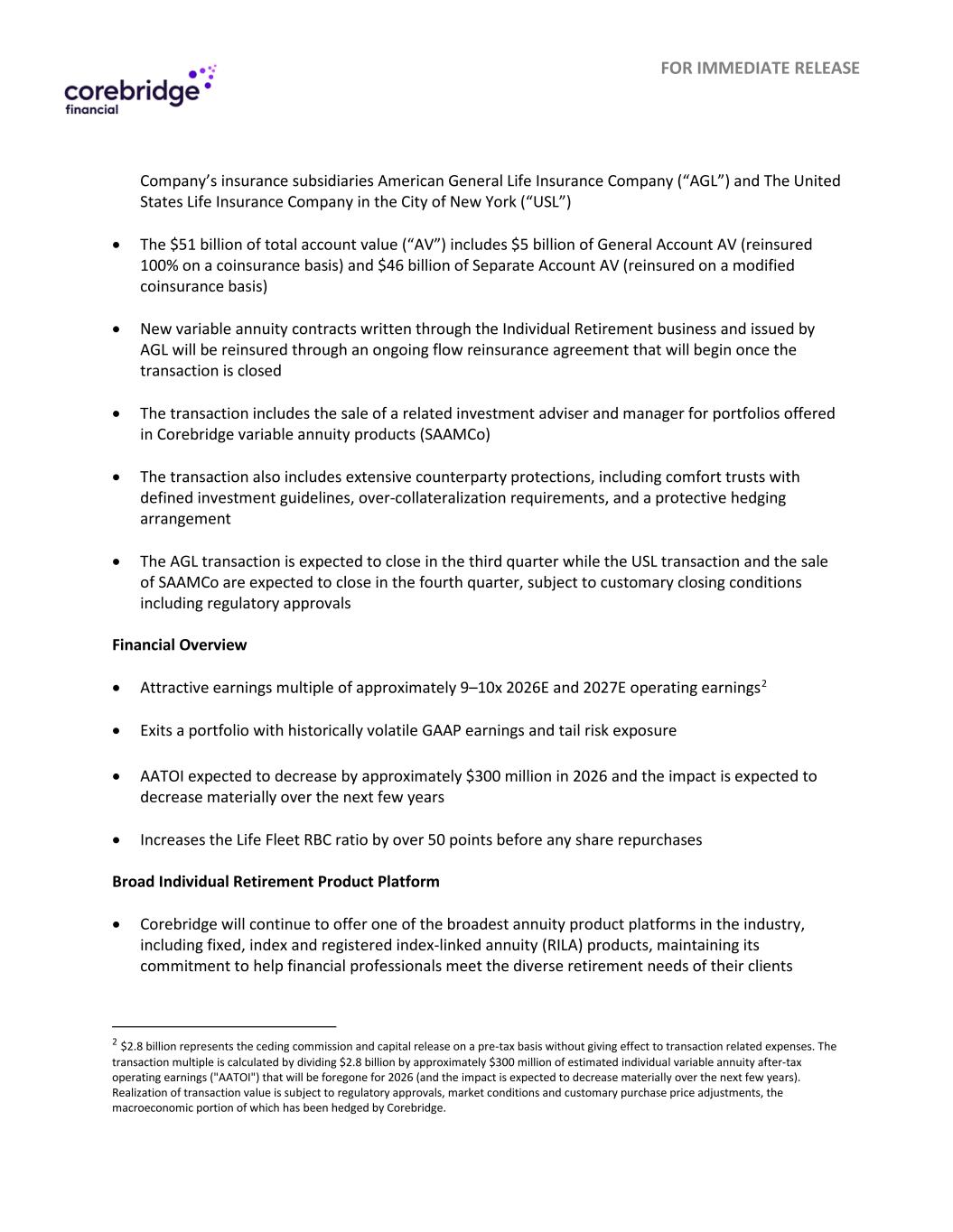 FOR IMMEDIATE RELEASE公司的保险子公司American General Life Insurance Company(“AGL”)和纽约市美国人寿保险公司(“USL”)• 510亿美元的账户总价值(“AV”)包括50亿美元的普通账户AV(在共同保险基础上100%再保险)和460亿美元的独立账户AV(在修改后的共同保险基础上再保险)•通过个人退休业务编写并由AGL签发的新的可变年金合同将通过持续的流量再保险协议进行再保险交易完成后将开始•交易包括出售Corebridge可变年金产品(SAAMCo)中提供的投资组合的相关投资顾问和经理•交易还包括广泛的交易对手保护,包括具有明确投资准则的舒适信托、超额抵押要求和保护性对冲安排• AGL交易预计将在第三季度完成,而USL交易和SAAMCo的出售预计将在第四季度完成,受制于惯例成交条件,包括监管部门的批准财务概览•具有吸引力的收益倍数约为2026年和2027年营业收入的9 – 10倍2 •退出具有历史波动的GAAP收益和尾部风险敞口的投资组合• AATOI预计将在2026年减少约3亿美元,预计未来几年影响将大幅减少•在任何股票回购之前将Life Fleet RBC比率提高50个百分点广泛的个人退休产品平台• Corebridge将继续提供业内最广泛的年金产品平台之一,包括固定、指数和注册指数挂钩年金(RILA)产品,维持其帮助金融专业人士满足客户多样化退休需求的承诺2 28亿美元代表在税前基础上分出佣金和资本释放,而不影响交易相关费用。交易倍数的计算方法是,将28亿美元除以2026年将放弃的约3亿美元的估计个人可变年金税后运营收益(“AATOI”)(预计未来几年该影响将大幅下降)。交易价值的实现取决于监管机构的批准、市场条件和惯常的购买价格调整,其中的宏观经济部分已被Corebridge对冲。