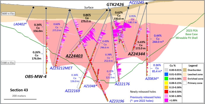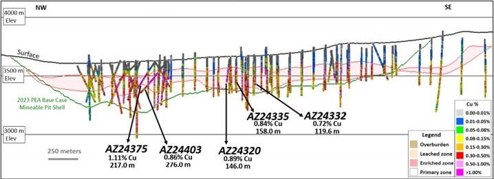 图3显示了1.11% Cu(AZ24375)的217 m截距,包括富集带内的1.32% Cu的100 m间隔。这个洞填补了矿床中心内的数据空白,证实了更高品位矿化的连续性。
