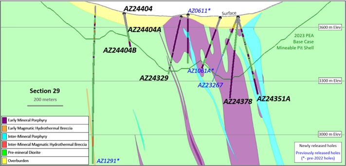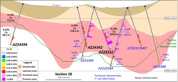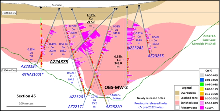 | · | 孔AZ24375,钻探至369m深度,返回217米的1.11%铜在浓缩区,包括100米的1.32%铜. |