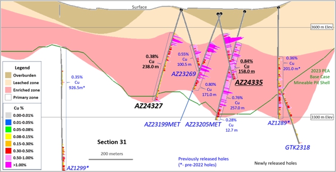 图6显示了在富集带内截获的158m的0.84% Cu(AZ24335),其中包括78.5m的1.10% Cu。钻孔以矿化物质结束,表明如先前发布的钻孔所示,在富集带内的深度继续矿化的潜力。