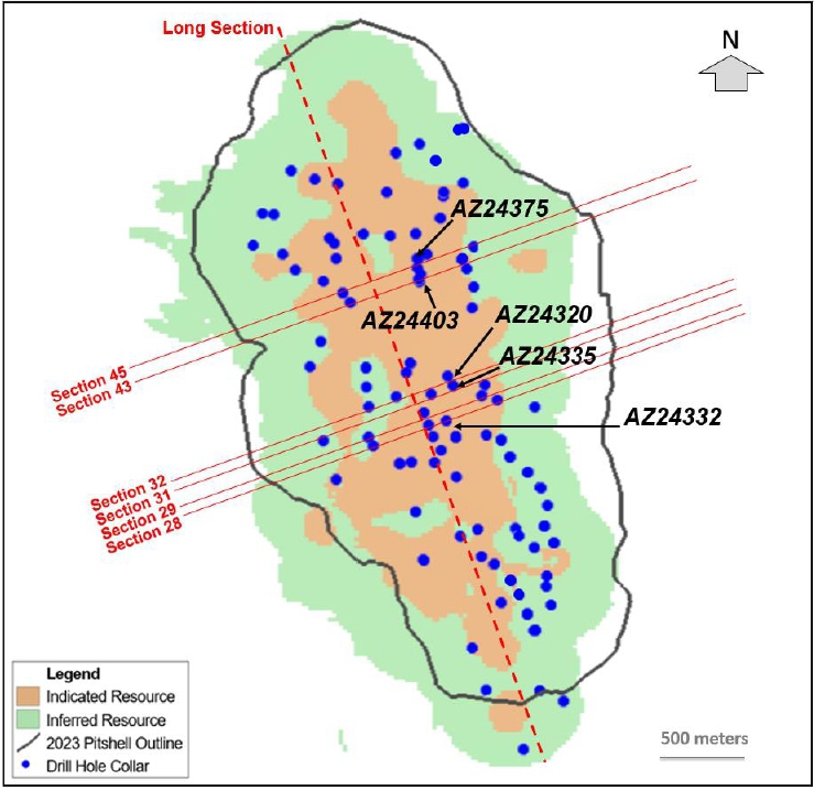 突出显示结果的位置以8个图表示。资源的平面图或鸟瞰图以及PEA坑的轮廓如图1所示。图2至图7显示了与2023年初步经济评估(PEA)的覆盖层、浸出、富集和原始带以及30年坑壳相关的近期钻探情况(以部分中的绿线标记)。图8代表了一个截面,上面有最近的钻探数据和推断的地质情况。