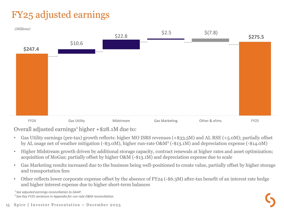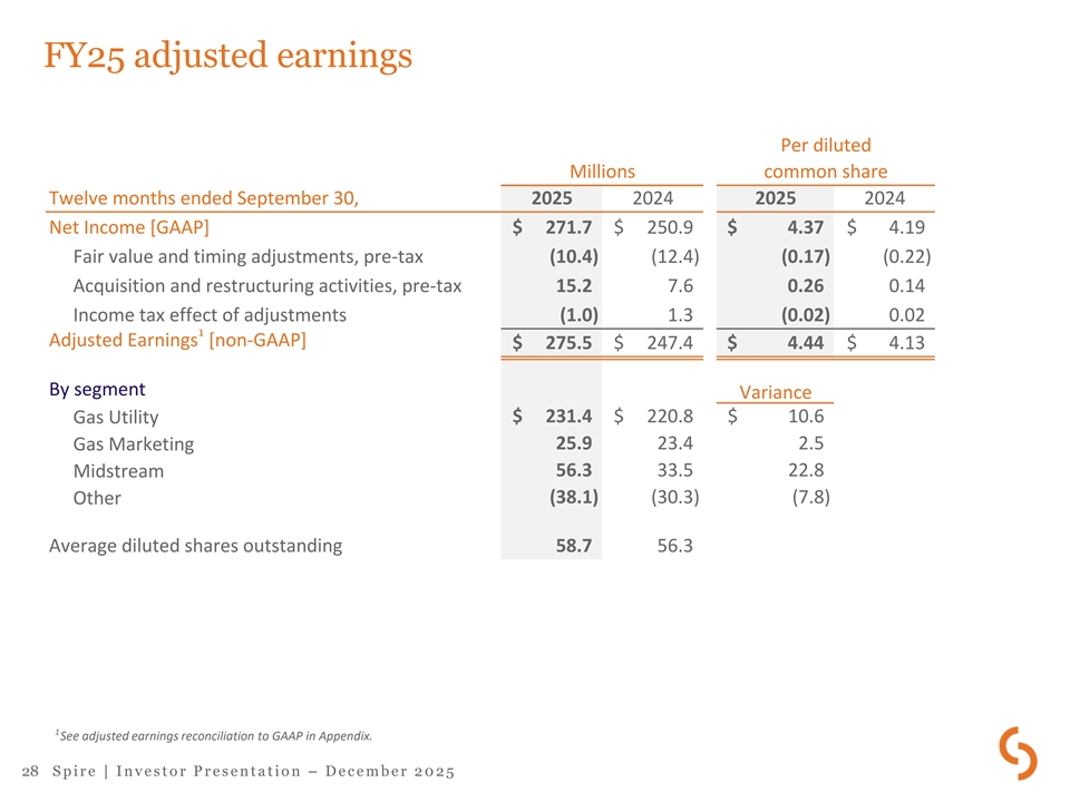 FY25调整后每股摊薄收益百万普通股截至2025年9月30日的十二个月202420252024净收益[ GAAP ] $ 271.7 $ 250.9 $ 4.37 $ 4.19公允价值和时间调整,税前(10.4)(12.4)(0.17)(0.22)收购和重组活动,税前15.27.6 0.26 0.14调整的所得税影响(1.0)1.3(0.02)0.02 1调整后收益[非公认会计原则] 275.5美元247.4美元4.44美元4.13美元按部门差异燃气公用事业231.4美元220.8美元10.6美元燃气营销25.9 23.4 2.556.33 3.52 2.8中游(38.1)(30.3)(7.8)其他平均稀释后流通股58.7 56.31见附录中调整后收益与公认会计原则的对账。28s p i r e | i n v e s t o r p r e s e n t a t i o n – d e c e m b e r 2025