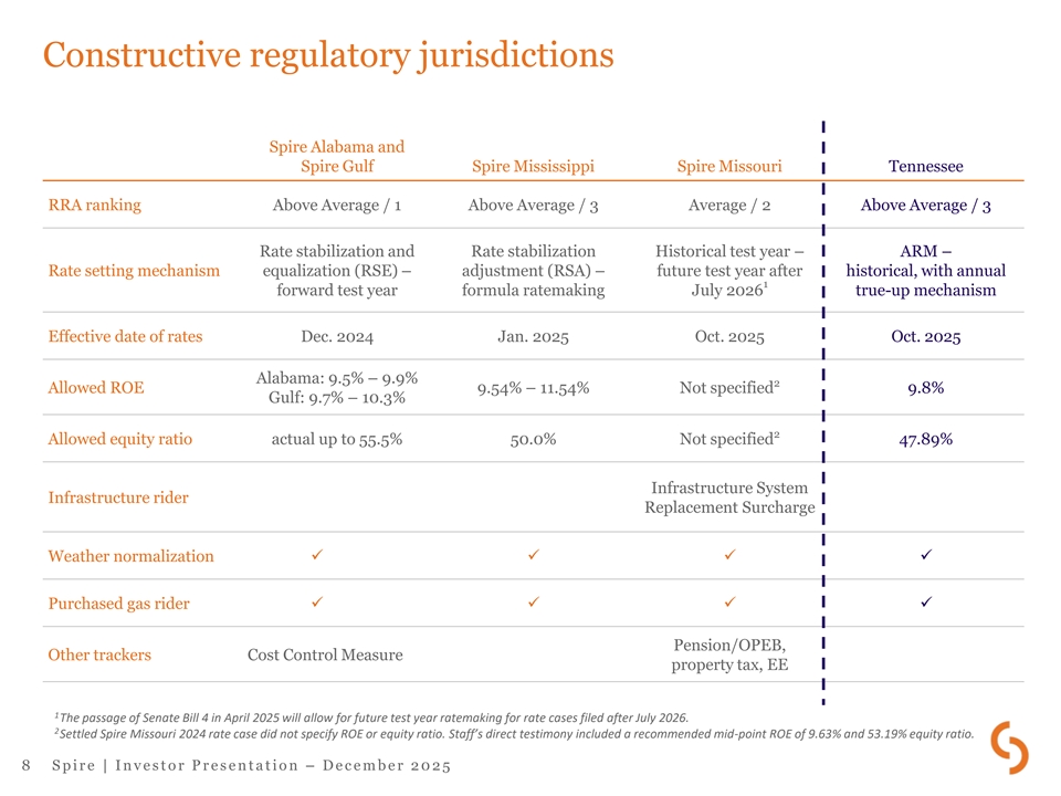 跨辖区增长推动的盈利能力1公用事业费率基数和总资本(十亿)FY26E FY30E $ 2.2 $ 1.6 $ 1.7 $ 2.120% 19% 21% 20% $ 0.3,4% $ 8.2B $ 0.4,4% $ 10.7B Missouri $ 4.6 $ 6.0 Gulf/Missississippi 56% Alabama 56% Tennessee 2 •长期EPS增长目标为5-7 %支持:–稳健的利率基数增长:密苏里州约7%,田纳西州约7.5% –受监管的股本增长:阿拉巴马州和海湾约6% –战略投资:5年资本计划为$ 4.8B(FY26-FY30E)–建设性资本回收机制1反映年终估计。Spire Alabama和Spire Gulf显示的金额反映了监管资本总额。出于利率制定的目的,2 Alabama的RSE机制将股本回报率应用于资本结构中的平均监管普通股本,而不是费率基数。以27财年指引中点5.75美元为基数。7 S p i r e | i n v e s t o r p r e s e n t a t i o n – d e c e m b e r 2025