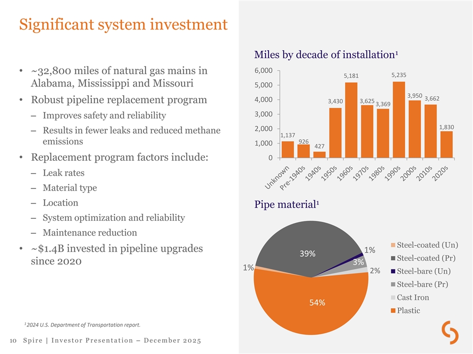 重大系统投资1miles by decade of installation 6,000 •~32,800 miles of natural gas mains in 5,2355,181 Alabama,密西西比州和密苏里州5,0003,9503,6624,0003,625 •稳健的管道更换计划3,4303,3693,000 –提高安全性和可靠性1,8302,000 –减少泄漏并减少甲烷1,137926排放1,0427 •更换计划因素包括:0–泄漏率–材料类型1 –位置管道材料–系统优化和可靠性–维护减少钢涂层(UN)•自2020年以来投资于管道升级1% 39%钢涂层(PR)3% 1% 2%钢裸式(UN)钢裸式(PR)铸铁54%塑料2024年美国交通部报告。10 S p i r e | i n v e s t o r p r e s e n t a t i o n – d e c e m b e r 2025