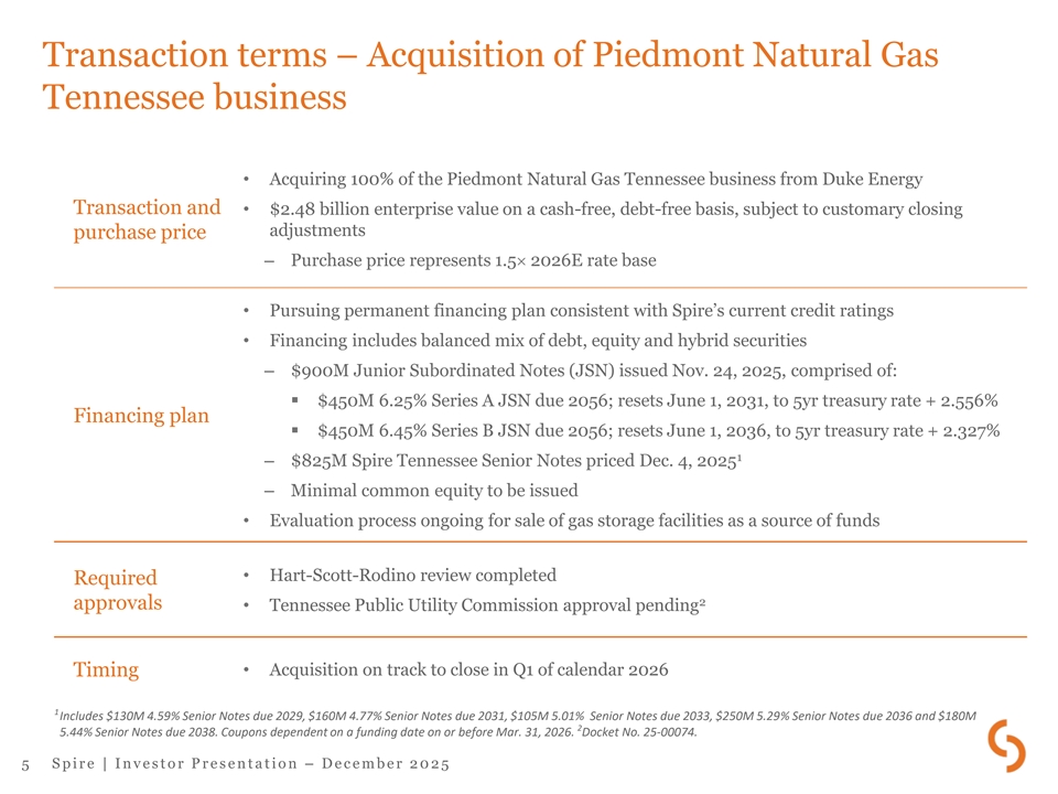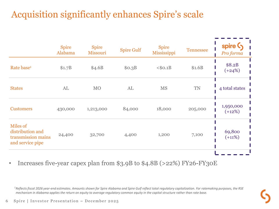 交易条款–收购Piedmont Natural Gas Tennessee业务•从杜克能源交易中收购Piedmont Natural Gas Tennessee业务100%的股份,并•在无现金、无债务的基础上获得24.8亿美元的企业价值,但须按惯例进行收盘调整购买价格–购买价格代表1.5 ↓ 2026E利率基•寻求与Spire当前信用评级一致的永久融资计划•融资包括债务、股权和混合证券的平衡组合—— 2025年11月24日发行的9亿美元初级次级票据(JSN),包括:▪2056年到期的4.5亿美元6.25% A系列JSNN;2031年6月1日重置,至5年期国债利率+ 2.556%融资计划▪2056年到期的4.5亿美元6.45% B系列JSN1;将2036年6月1日重置为5年期国债利率+ 2.327% 1 – 2025年12月4日定价的8.25亿美元Spire Tennessee优先票据–将发行的最低普通股•正在进行的出售储气设施作为资金来源的评估过程• Hart-Scott-Rodino审查完成需要2项批准•田纳西州公用事业委员会批准待定时间•收购有望在2026年第一季度完成1包括1.3亿美元、2029年到期的4.59%优先票据、1.6亿美元、2031年到期的4.77%优先票据,2033年到期的1.05亿美元5.01%优先票据、2036年到期的2.5亿美元5.29%优先票据和2038年到期的1.8亿美元25.44%优先票据。取决于2026年3月31日或之前的筹资日期的息票。第25-00074号案卷。5 S p i r e | i n v e s t o r p r e s e n t a t i o n – d e c e m b e r 2025