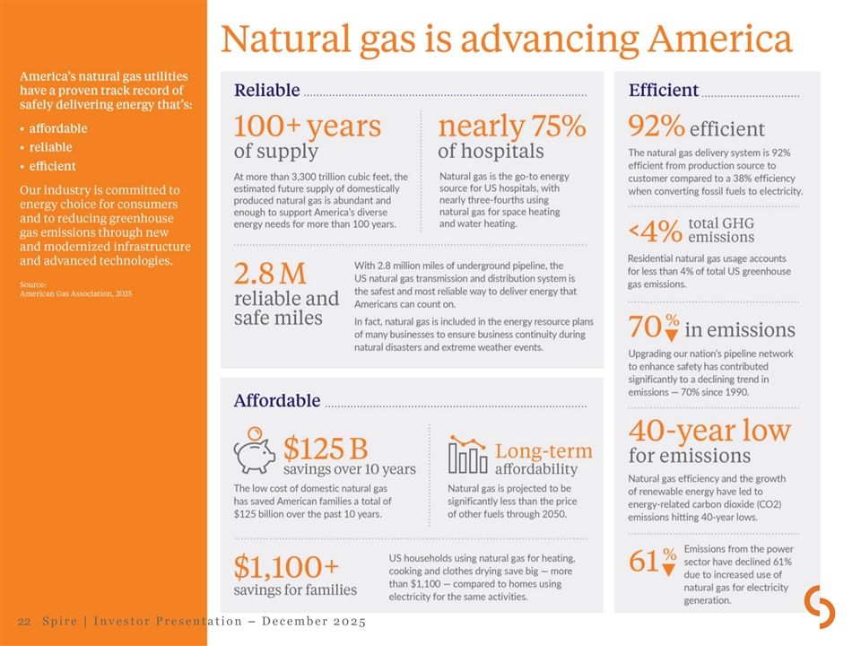 前瞻性陈述和非公认会计原则措施的使用本演示文稿包含1995年《私人证券诉讼改革法案》含义内的前瞻性陈述。我们在本演示文稿中的前瞻性陈述仅在今天发表,我们不承担更新它们的义务。前瞻性陈述通常由以下词语识别,但不限于:“估计”、“预期”、“预期”、“打算”、“目标”、“计划”、“预测”和类似表述。尽管我们的前瞻性陈述是基于合理的假设,但各种不确定性和风险因素可能会导致未来的业绩或结果与预期不同。有关这些不确定性和风险因素的更完整描述和清单,请参见我们向美国证券交易委员会提交的年度(10-K表)和季度(10-Q表)文件。该演示文稿还包括“调整后收益”、“调整后每股收益”和“边际贡献”,这是管理层在评估公司业绩和经营业绩时内部使用的非GAAP衡量标准。调整后的收益不包括净收入(如适用)、与能源相关交易相关的公允价值会计和时间调整的税后影响、收购、剥离和重组活动的影响以及减值和其他非经常性或不寻常项目(如某些监管、立法或GAAP标准制定行动)的大部分非现金影响。公允价值和时间调整主要影响天然气营销部门,包括能源相关衍生工具的未实现净损益,这些净损益是由于金融和实物交易在完成和结算之前的当前公允价值变动、成本或市场库存调整中的较低者,以及在实物商品销售之前的经济套期保值已实现损益。管理层认为,排除这些项目可以很好地反映实际结算交易的经济影响和持续经营的总体结果。边际贡献定义为营业收入减去天然气成本和毛收税费用,直接转嫁给客户并通过收入收取。这些内部非GAAP运营指标不应被视为营业收入、净收入或每股收益等GAAP指标的替代或更有意义的指标。调整后收益与净收入的对账包含在我们提交给SEC的文件和本演示文稿的附录中。注:本演示文稿中显示的年份为截至9月30日的财政年度。投资者关系联系人:Megan L. McPhail董事总经理,投资者关系314-309-6563 | Megan.McPhail@SpireEnergy.com 21 S p i r e | i n v e s t o r p r e s e n t a t i o n – d e c e m b e r 2025
