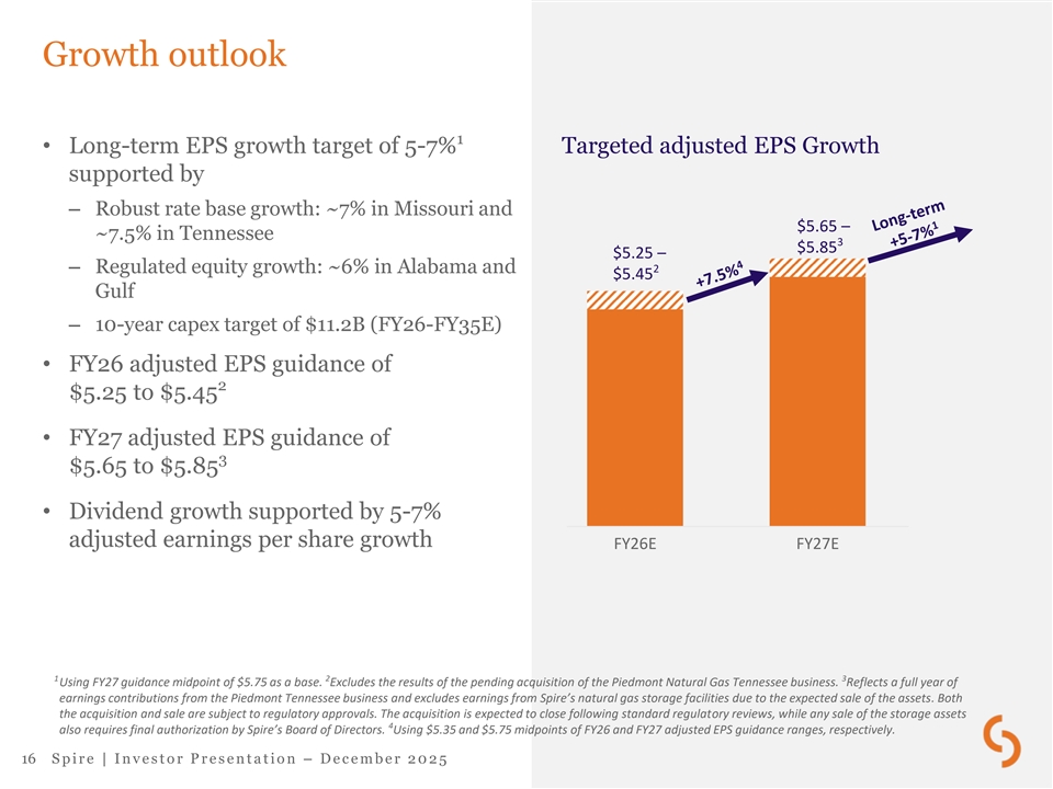 25财年调整后收益(百万)$ 2.5 $(7.8)$ 22.8 $ 275.5 $ 10.6 $ 247.4 FY24 Gas Utility Midstream Gas Marketing Other & elims FY25 1整体调整后收益增加+ 2810万美元,原因是:• Gas Utility收益(税前)增长反映出:MO ISRS收入(+ 3350万美元)和AL RSE(+ 500万美元)增加;部分被AL使用净额(-300万美元)、更高的运行率O & M(-1310万美元)和折旧费用(-1400万美元)抵消2 •额外存储容量推动的更高的中游增长,以更高的费率续签合同和资产优化;收购MoGas;部分被规模导致的更高的O & M(-1310万美元)和折旧费用所抵消•由于业务处于创造价值的有利位置,天然气营销业绩增加,部分被更高的存储和运输费用所抵消•其他反映出较低的公司费用被没有24财年(-630万美元)的利率对冲的税后收益和由于短期余额增加而导致的更高的利息费用所抵消1见调整后的与GAAP的收益调节。2关于运行率O & M对账,请参见附录中的25财年关键差异。15s p i r e | i n v e s t o r p r e s e n t a t i o n – d e c e m b e r 2025