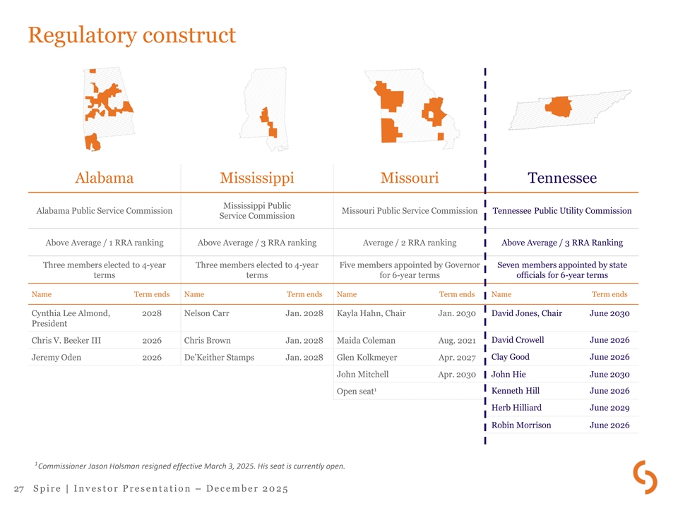 监管结构阿拉巴马州密西西比州密苏里州田纳西州密西西比州公共阿拉巴马州公共服务委员会密苏里州公共服务委员会田纳西州公共事业委员会服务委员会高于平均水平/1个RRA排名高于平均水平/3个RRA排名平均水平/2个RRA排名高于平均水平/3个RRA排名三名成员当选4年三名成员当选4年五名成员由州长任命七名成员由州任期任命6年任期官员6年任期姓名任期结束姓名任期结束姓名任期结束姓名任期结束姓名任期结束姓名任期结束姓名任期结束Cynthia Lee Almond,2028年1月Kayla Hahn,主席2030年1月David Jones,主席2030年6月总裁Chris V. Beeker III 2026年1月Chris Brown 2028年1月Maida Coleman 2021年8月David Crowell 2026年6月Jeremy Oden 2026年De’Keither邮票2028年1月Glen Kolkmeyer 2027年4月Clay Good June 2026年John Mitchell 2030年4月John Hie 2030年6月1公开席位Kenneth Hill 2026年6月Herb Hilliard 2029年6月Robin Morrison 2026年6月1专员Jason Holsman辞职,自2025年3月3日起生效。他的座位目前开放。27 S p i r e | i n v e s t o r p r e s e n t a t i o n – d e c e m b e r 2025