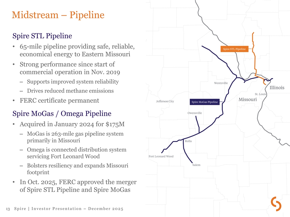 Spire Marketing概览•在整个北美提供天然气营销服务–关系驱动的业务交付~1.22 BCF/d(2025年)–稳固的运输能力~1 BCF/d –大部分业务是批发–为生产商、管道、发电机、公用事业和其他服务–零售业务为大型C & I客户提供营销服务•通过优化商品创造价值,运输和仓储组合•强大的风险管理•稳定的现金流贡献者12 S p i r e | i n v e s t o r p r e s e n t a t i o n – d e c e m b e r 2025