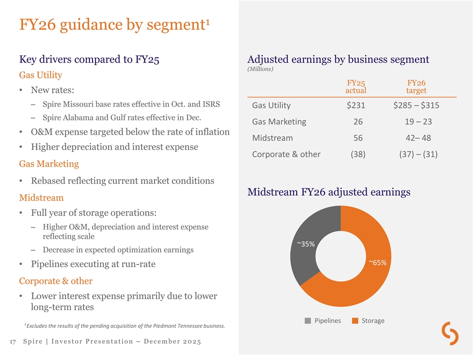 增长前景1 •长期每股收益增长目标为5-7 %目标调整后每股收益增长得到支持–稳健的利率基数增长:密苏里州约7%,田纳西州约5.65美元–~7.5% 3美元5.85美元5.25美元––受监管的股本增长:阿拉巴马州约6%,海湾地区2美元5.45美元– 10年资本支出目标为11.2B美元(FY26-FY35E)• FY26调整后每股收益指引为2美元5.25至5.45美元• FY27调整后每股收益指引为3美元5.65至5.85美元• FY27调整后每股收益增长5-7 %支持的股息增长FY26-FY27E 123使用FY27指引中点5.75美元作为基数。不包括待定收购皮埃蒙特天然气田纳西州业务的结果。反映了皮埃蒙特田纳西州业务全年的收益贡献,不包括由于预期出售资产而导致的Spire天然气储存设施的收益。收购和出售均需获得监管部门的批准。此次收购预计将在标准监管审查后完成,同时存储资产4的任何出售也需要获得Spire董事会的最终授权。分别使用FY26和FY27调整后EPS指导区间的5.35美元和5.75美元中点。16 S p i r e | i n v e s t o r p r e s e n t a t i o n – d e c e m b e r 2025