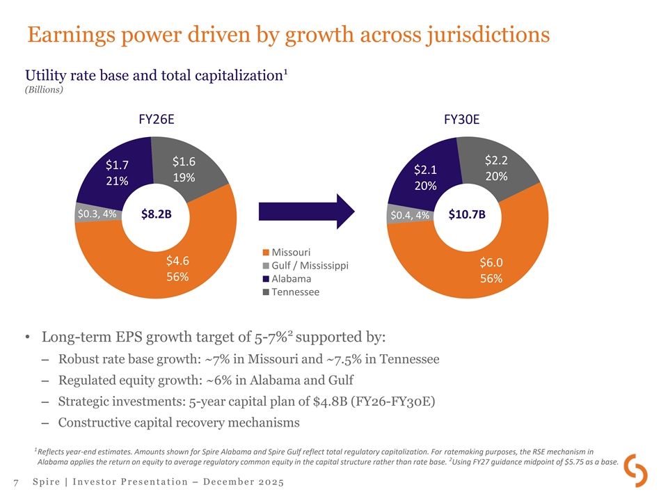 收购显着提升Spire的规模Spire Spire Spire Spire Spire Gulf Tennessee Alabama Missouri Missississippi备考$ 8.2B 1利率基础$ 1.7B $ 4.6B $ 0.3B < $ 0.1B $ 1.6B(+ 24%)States AL MO AL MS TN 4 total states 1,950,000 customers 430,0001,213,00084,00018,000205,000(+ 12%)miles of distribution and 69,80024,40032,7004,4001,2007,100 transmission main(+ 11%)and service pipe •将五年资本支出计划从$ 3.9B增加到$ 4.8B(> 22%)FY26-FY30E 1反映了2026年年底的估计。Spire Alabama和Spire Gulf显示的金额反映了监管资本总额。出于利率制定的目的,阿拉巴马州的RSE机制将股本回报率应用于资本结构中的平均监管普通股权益,而不是费率基数。6 S p i r e | i n v e s t o r p r e s e n t a t i o n – d e c e m b e r 2025