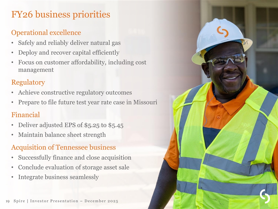 基础业务融资计划不包括田纳西州收购债务到期和预期发行•股权(百万)– FY26E至FY28E:每年0-5亿美元•债务–到期再融资和资本计划融资700美元550美元– 2亿美元Spire Missouri First Mortgage 480美元100美元1债券于10月23日发行45美元0美元•用于一般公司FY26E FY27E FY28E用途的收益预期发行• FFO/15-16 %的债务目标1包括2030年9月15日到期的1.5亿美元4.60% FMB和2031年1月15日到期的5000万美元4.65% FMB。18 S p i r e | i n v e s t o r p r e s e n t a t i o n – d e c e m b e r 2025