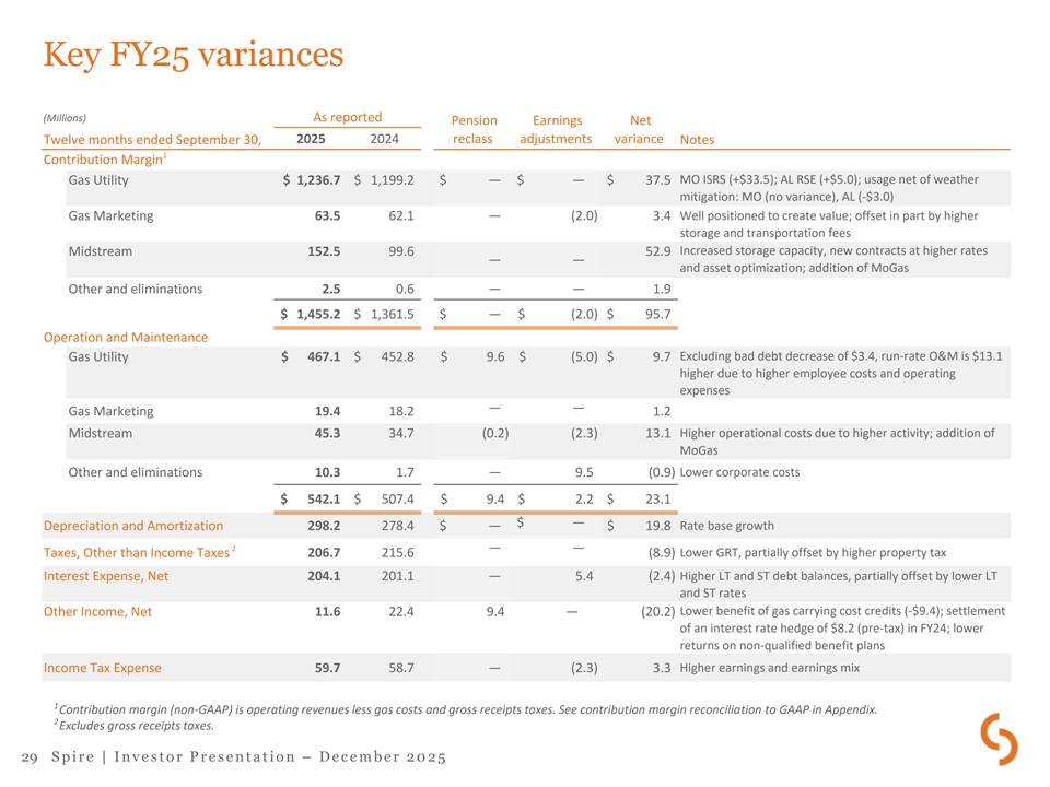 25财年关键差异(百万)报告的养老金收益净重分类调整差异截至2025年9月30日的12个月2024年注1缴款利润率MO ISRS(+ 33.5美元);AL RSE(+ 5.0美元);扣除天气燃气公用事业后的使用量$ 1,236.7 $ 1,199.2 $ ― $ ― 37.5缓解:MO(无差异),AL(-3.0美元)天然气营销63.56 2.1 $ ―(2.0)3.4有能力创造价值;部分被更高的储存和运输费用增加的储存能力所抵消,更高费率的新合同中游152.599.65 2.9 $ ― $ ―和资产优化;增加MoGas其他和冲销2.5 0.6 $ ― $ ― 1.9 $ 1,455.2 $ 1,361.5 $ ― $(2.0)$ 95.7不包括坏账的运营和维护减少3.4美元,运行率O & M为13.1美元Gas Utility 467.1美元452.8美元9.6美元(5.0)高出9.7美元,原因是员工成本和运营费用增加$ ― $ ― Gas Marketing 19.4 18.2 1.2 Midstream 45.33 4.7(0.2)(2.3)13.1运营成本增加,原因是活动增加;加上MoGas Other和eliminations 10.3 1.7 $ ― 9.5(0.9)降低企业成本542.1美元507.4美元9.4美元2.2美元23.1美元―折旧和摊销298.2 278.4美元― 19.8费率基数增长2美元― $ ―税,除所得税外206.72 15.6(8.9)降低GRT,部分被更高的物业税利息支出所抵消,净额204.1201.1 $ ― 5.4(2.4)更高的LT和ST债务余额,部分被更低的LT和ST费率降低的天然气持有成本抵免额(-9.4美元)所抵消;结算其他收入,净11.6 22.4 9.4 $ ―(20.2)的24财年8.2美元(税前)的利率对冲;不合格福利计划的较低回报更高的收益和收益组合所得税费用59.758.7 $ ―(2.3)3.31贡献利润率(非公认会计准则)是营业收入减去天然气成本和毛收款税。见附录中贡献利润率与GAAP的对账。2不包括毛收款税。29 S p i r e | i n v e s t o r p r e s e n t a t i o n – d e c e m b e r 2025