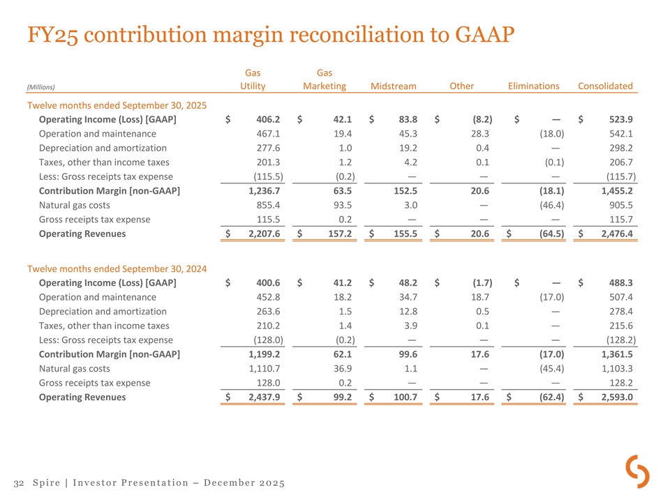 25财年调整后收益与GAAP Gas Gas每摊薄2公用事业营销中游其他总普通股的对账(百万,每股金额除外)截至2025年9月30日的12个月净收入(亏损)[ GAAP ] 231.4美元33.7美元56.3美元(49.7)271.7美元4.37美元调整,税前:公允价值和时间调整——(10.4)——(10.4)(0.17)收购活动—— 15.2 15.2 0.26 1调整的所得税影响—— 2.6 ——(3.6)(1.0)(0.02)调整后收益(亏损)[非公认会计原则] $ 231.4 $ 25.9 $ 56.3 $(38.1)$ 275.5 $ 4.44截至2024年9月30日的12个月净收益(亏损)[公认会计原则] $ 217.0 $ 32.7 $ 31.7 $(30.5)$ 250.9 $ 4.19调整,税前:公允价值和时间调整——(12.4)——(12.4)(0.22)收购和重组活动5.0 — 2.3 0.37.6 0.14 1调整的所得税影响(1.2)3.1(0.5)(0.1)1.3 0.02调整后收益(亏损)[非美国通用会计准则] $ 220.8 $ 23.4 $ 33.5 $(30.3)$ 247.4 $ 4.13 1所得税的计算方法是将适用于普通收入的联邦、州和地方所得税税率应用于税前调节项目的金额。2调整后每股收益的计算方法是在GAAP摊薄每股收益计算中将合并净收益替换为合并调整后收益。31 S p i r e | i n v e s t o r p r e s e n t a t i o n – d e c e m b e r 2025