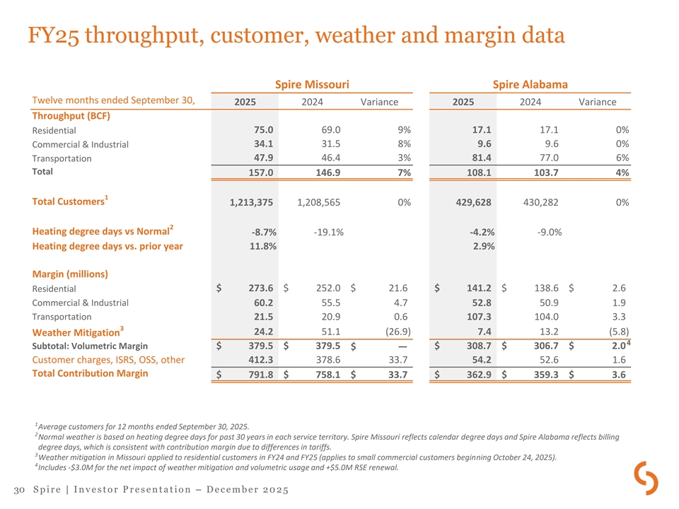 25财年吞吐量、客户、天气和利润率数据Spire Missouri Spire Alabama截至9月30日的12个月,20252024差异20252024差异吞吐量(BCF)75.06 9.09% 17.117.10%住宅34.13 1.58% 9.69.60%商业和工业47.9 46.43% 81.477.06%运输总额157.01 46.97% 108.1 103.74% 1总客户1,213,3751,208,5650% 429,628430,2820% 2供暖度日与正常-8.7 %-19.1 %-4.2 %-9.0 %供暖度日与上年11.8% 2.9%利润率(百万)$ 273.6 $ 252.0 $ 21.6 $ 141.2 $ 138.6 $ 2.6住宅商业和工业60.255.5 4.75 2.85 0.9 1.9运输21.52 0.9 0.6 107.3 104.0 3.33 24.25 1.1(26.9)7.41 3.2(5.8)天气缓解4小计:数量保证金$ 379.5 $ 379.5 $ — $ 308.7 $ 306.7 $ 2.0客户费用、ISRS、OSS、其他412.33 78.63 3.75 4.25 2.6 1.6总贡献保证金$ 791.8 $ 758.1 $ 33.7 $ 362.9 $ 359.3 $ 3.61截至2025年9月30日止12个月的平均客户。2正常天气以各服务区域近30年供暖度日为准。Spire Missouri反映日历学位日,Spire Alabama反映计费学位日,由于关税差异,与贡献边际一致。3密苏里州的天气缓解措施适用于24财年和25财年的住宅客户(适用于2025年10月24日开始的小型商业客户)。4包括-300万美元用于天气缓解和体积使用的净影响以及+ 500万美元的RSE更新。30s p i r e | i n v e s t o r p r e s e n t a t i o n – d e c e m b e r 2025