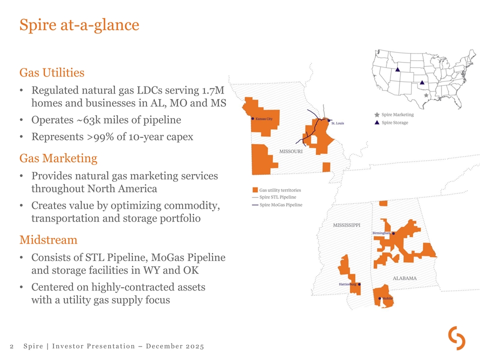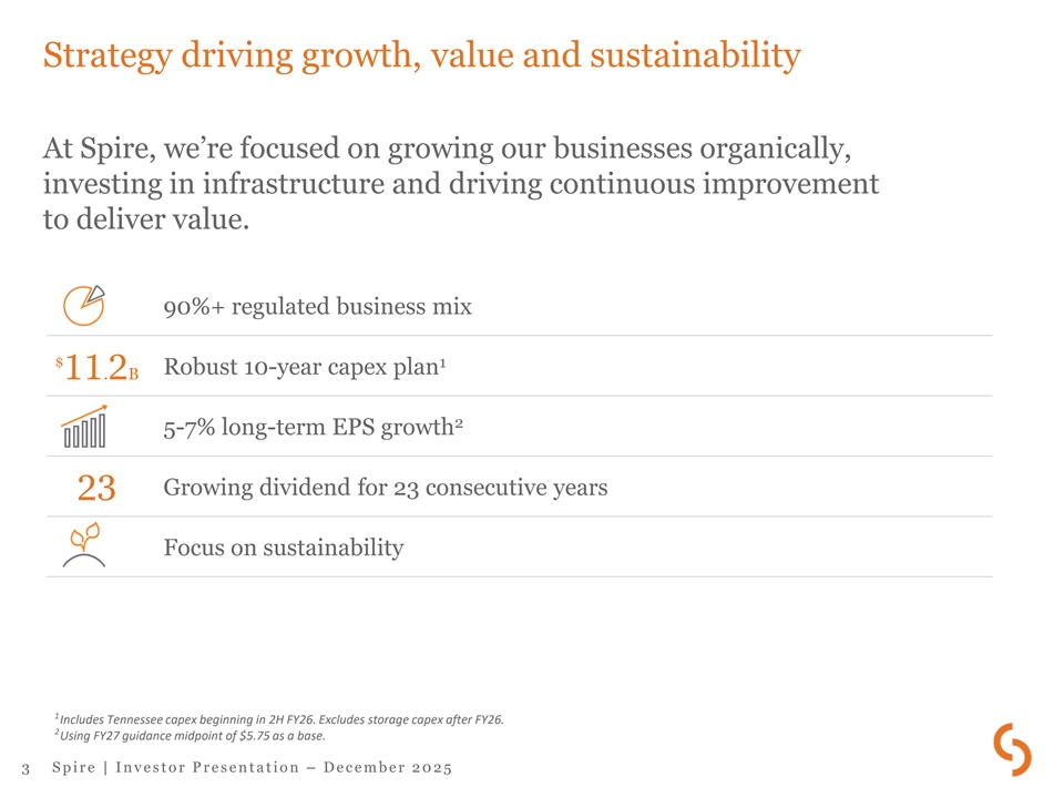 Spire一目了然的天然气公用事业公司•受监管的天然气最不发达国家为AL、MO和MS的170万户家庭和企业提供服务•运营约6.3万英里的管道•占10年期资本支出天然气营销的> 99% •在整个北美提供天然气营销服务•通过优化商品、运输和储存组合来创造价值中游•由STL管道、MoGas管道和储存设施在WY和OK •以高度签约资产为中心,公用事业燃气供应重点2 S p i r e | i n v e s t o r p r e s e n t a t i o n – d e c e m b e r 2025