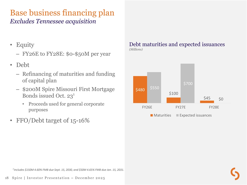 1按部门划分的26财年指引按业务部门划分的关键驱动因素与按业务部门划分的25财年调整后收益(百万)燃气公用事业25财年•新费率:实际目标– Spire Missouri基本费率10月生效,ISRS燃气公用事业231美元285 – 315美元– Spire阿拉巴马州和海湾费率12月生效。天然气营销2619 – 23 • O & M费用目标低于通货膨胀率中游5642 – 48 •更高的折旧和利息支出Corporate & Other(38)(37)–(31)Gas Marketing • Rebase reflecting current market conditions Midstream FY26 adjusted earnings Midstream •全年存储业务:–更高的O & M、折旧和利息支出反映规模~35% –预期优化收益下降~65% •以运行率执行的管道Corporate & Other •较低的利息支出主要是由于较低的长期费率Pipelines Storage 1不包括待定收购Piedmont Tennessee业务的结果。17 S p i r e | i n v e s t o r p r e s e n t a t i o n – d e c e m b e r 2025