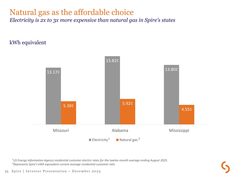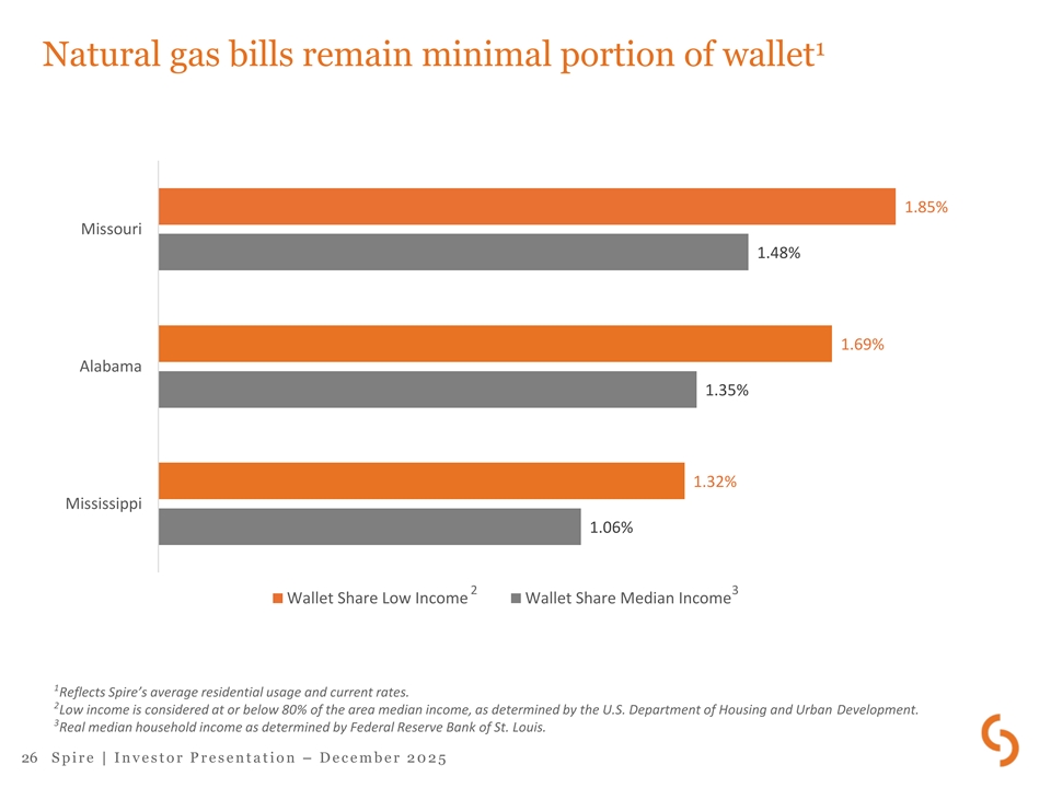 天然气作为负担得起的选择在Spire的各州,电力比天然气贵2到3倍,相当于15.82美分13.80美分13.17美分5.92美分5.38美分4.55美分密苏里州阿拉巴马州密西西比州12电力天然气1美国能源信息署截至2025年8月的12个月平均住宅客户电费。2代表Spire的kWh等效当前平均住宅客户费率。25S p i r e | i n v e s t o r p r e s e n t a t i o n – d e c e m b e r 2025