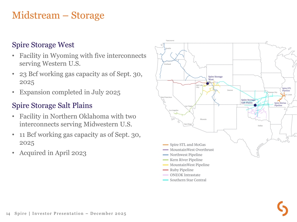 SLL Midstream – Pipeline Spire STL Pipeline • 65英里长的管道为密苏里州东部提供安全、可靠、经济的能源•自2019年11月开始商业运营以来表现强劲–支持提高系统可靠性–推动减少甲烷排放• FERC证书永久Spire MoGas/Omega Pipeline •于2024年1月以1.75亿美元收购– MoGas是主要在密苏里州的263英里长的天然气管道系统– Omega连接的分配系统服务于Fort Leonard Wood –增强弹性并扩大密苏里州足迹• 2025年10月,FERC批准Spire STL Pipeline和Spire MoGas合并13 S p i r e | i n v e s t o r p r e s e n t a t i o n – d e c e m b e r 2025