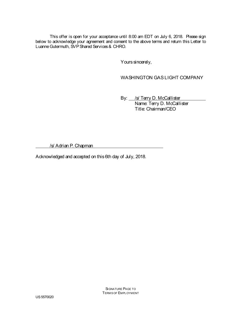 This offer is open for your acceptance until 8:00 am EDT on July 6, 2018. Please sign below to acknowledge your agreement and consent to the above terms and return this Letter to Luanne Gutermuth, SVP Shared Services & CHRO. Yours sincerely, WASHINGTON GAS LIGHT COMPANY By: /s/ Terry D. McCallister Name: Terry D. McCallister Title: Chairman/CEO /s/ Adrian P. Chapman Acknowledged and accepted on this 6th day of July, 2018. SIGNATURE PAGE TO TERMS OF EMPLOYMENT US 5570020