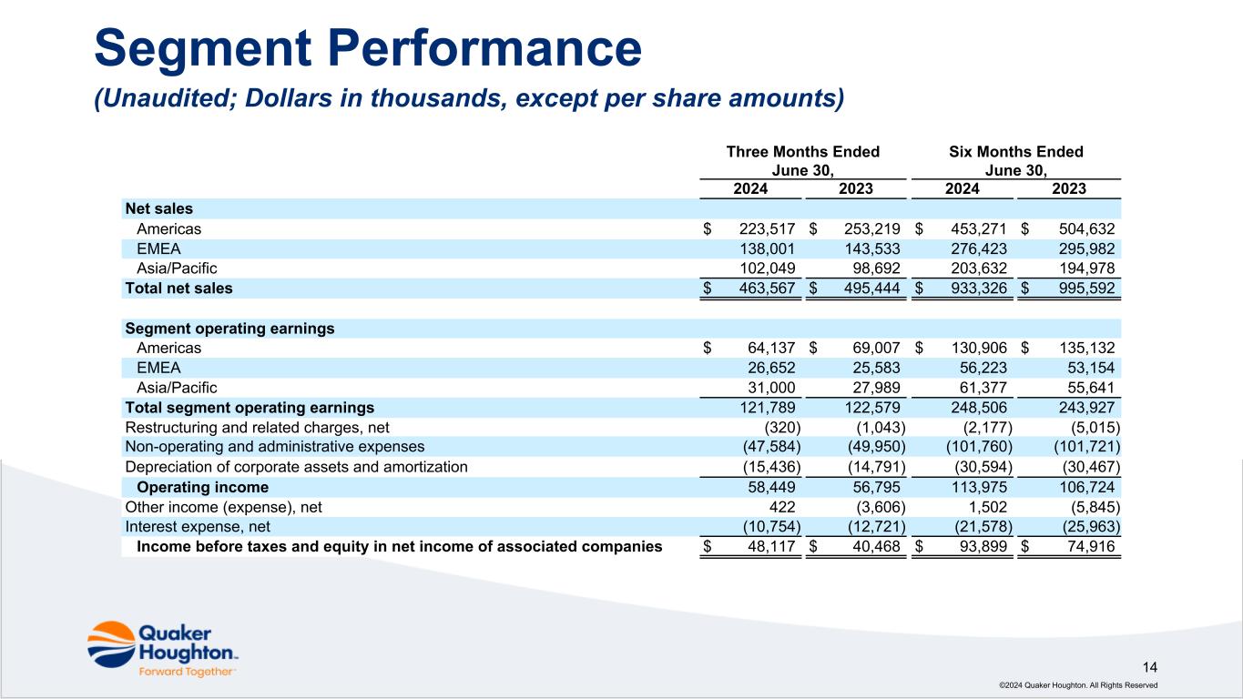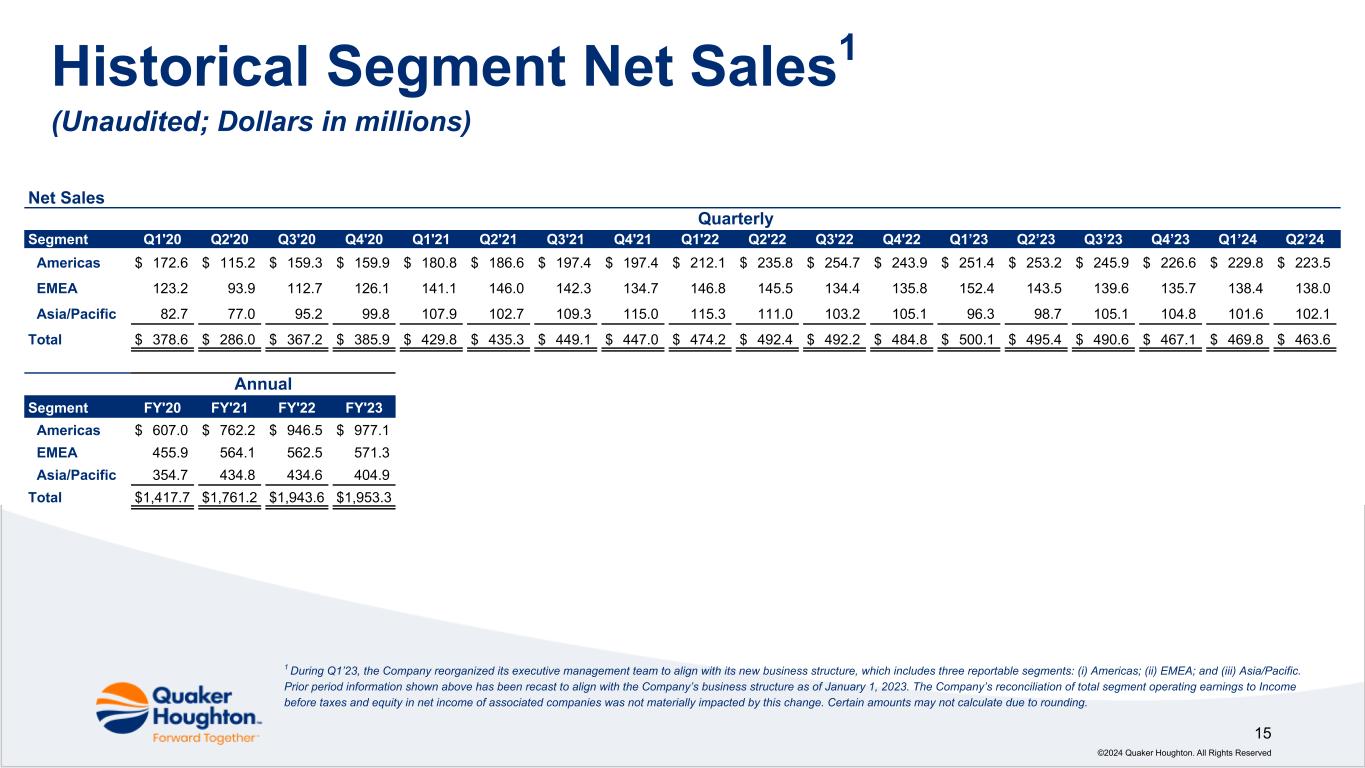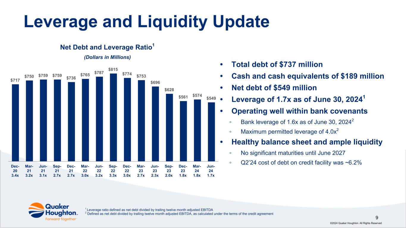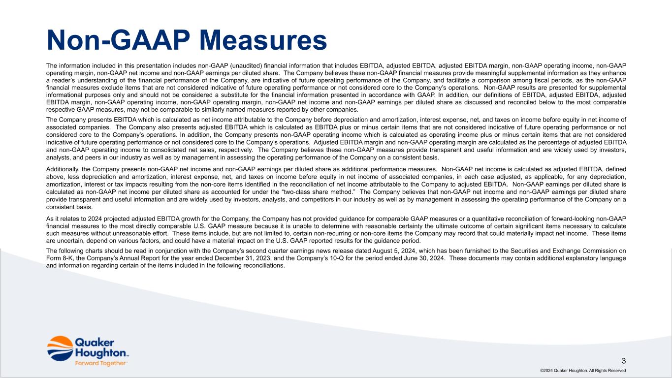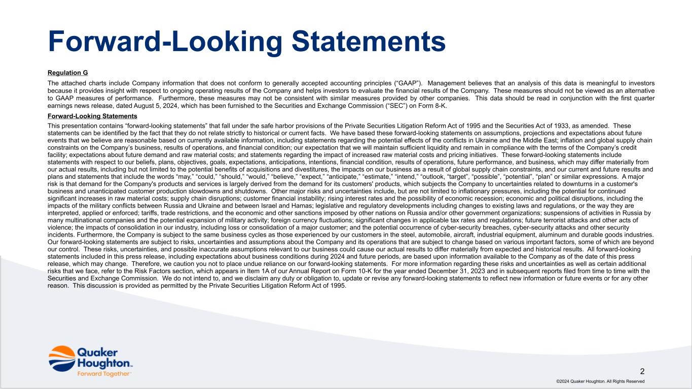 条例G所附图表包含不符合公认会计原则(“GAAP”)的公司信息。管理层认为,对这些数据的分析对投资者而言是有意义的,因为它提供了有关公司持续经营业绩的洞察力,并有助于投资者评估公司的财务业绩。这些衡量标准不应被视为是GAAP业绩衡量标准的替代方案。此外,这些措施可能与其他公司提供的类似措施不一致。这些数据应与日期为2024年8月5日的第一季度收益新闻稿一起阅读,该新闻稿已通过8-K表格提交给美国证券交易委员会(“SEC”)。前瞻性陈述本演示文稿包含“前瞻性陈述”,这些陈述属于1995年《私人证券诉讼改革法案》和经修订的1933年《证券法》的安全港条款。这些陈述可以通过它们与历史或当前事实并不严格相关这一事实来识别。我们的这些前瞻性陈述基于对未来事件的假设、预测和预期,我们认为这些假设、预测和预期基于目前可获得的信息是合理的,包括关于乌克兰和中东冲突的潜在影响的陈述;通货膨胀和全球供应链对公司业务、经营业绩和财务状况的限制;我们预计我们将保持充足的流动性并继续遵守公司信贷额度的条款;对未来需求和原材料成本的预期;以及关于原材料成本增加和定价举措的影响的陈述。这些前瞻性陈述包括关于我们的信念、计划、目标、目标、期望、预期、意图、财务状况、经营业绩、未来业绩和业务的陈述,这些陈述可能与我们的实际结果存在重大差异,包括但不限于收购和资产剥离的潜在利益、全球供应链限制对我们业务的影响,以及我们当前和未来的结果和计划以及包括“可能”、“可能”、“应该”、“将”、“相信”、“预期”、“预期”、“估计”、“打算”、“展望”、“目标”、“可能”、“潜在”、“计划”或类似表述。一个主要风险是,对公司产品和服务的需求主要来自对其客户产品的需求,这使公司面临与客户业务低迷和意外的客户生产放缓和停工相关的不确定性。其他主要风险和不确定因素包括但不限于通胀压力,包括原材料成本可能继续大幅上涨;供应链中断;客户财务不稳定;利率上升和经济衰退的可能性;经济和政治混乱,包括俄罗斯和乌克兰之间以及以色列和哈马斯之间的军事冲突的影响;立法和监管方面的发展,包括对现有法律和法规的修改,或这些法律和法规的解释、应用或执行方式;关税、贸易限制,以及其他国家对俄罗斯和/或其他政府组织实施的经济和其他制裁;多家跨国公司暂停在俄罗斯的活动以及军事活动的潜在扩张;外汇波动;适用税率和法规的重大变化;未来的恐怖袭击和其他暴力行为;我们行业整合的影响,包括一个主要客户的损失或整合;以及网络安全漏洞、网络安全攻击和其他安全事件的潜在发生。此外,公司受制于钢铁、汽车、飞机、工业设备、铝和耐用品行业客户所经历的相同商业周期。我们的前瞻性陈述受到有关公司及其运营的风险、不确定性和假设的影响,这些风险、不确定性和假设可能会基于各种重要因素发生变化,其中一些因素超出我们的控制范围。这些风险、不确定性以及与我们业务相关的可能不准确的假设可能导致我们的实际结果与预期和历史结果存在重大差异。本新闻稿中包含的所有前瞻性陈述,包括对2024年和未来期间业务状况的预期,均基于截至本新闻稿发布之日公司可获得的信息,这些信息可能会发生变化。因此, 我们提醒您不要过分依赖我们的前瞻性陈述。有关这些风险和不确定性以及我们面临的某些额外风险的更多信息,请参阅风险因素部分,该部分出现在我们截至2023年12月31日止年度的10-K表格年度报告的第1A项以及随后不时向美国证券交易委员会提交的报告中。我们不打算、也不承担任何义务或义务更新或修改任何前瞻性陈述以反映新信息或未来事件或出于任何其他原因。这一讨论是在1995年《私人证券诉讼改革法案》允许的情况下提供的。© 2024 Quaker Houghton。保留所有权利2项前瞻性陈述