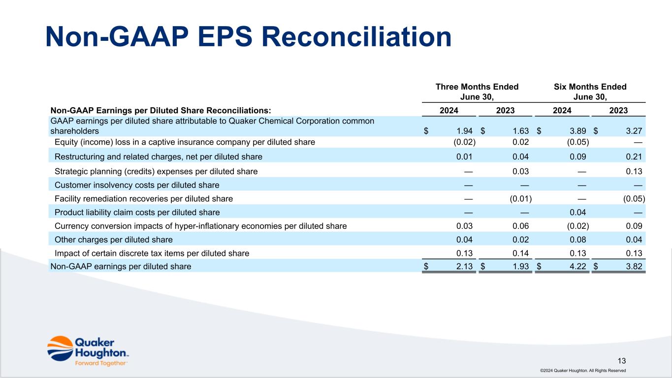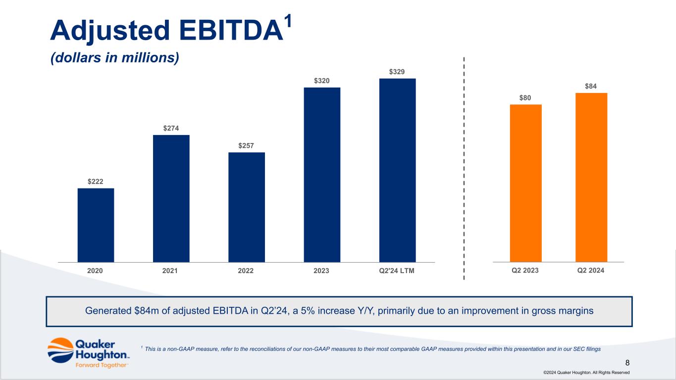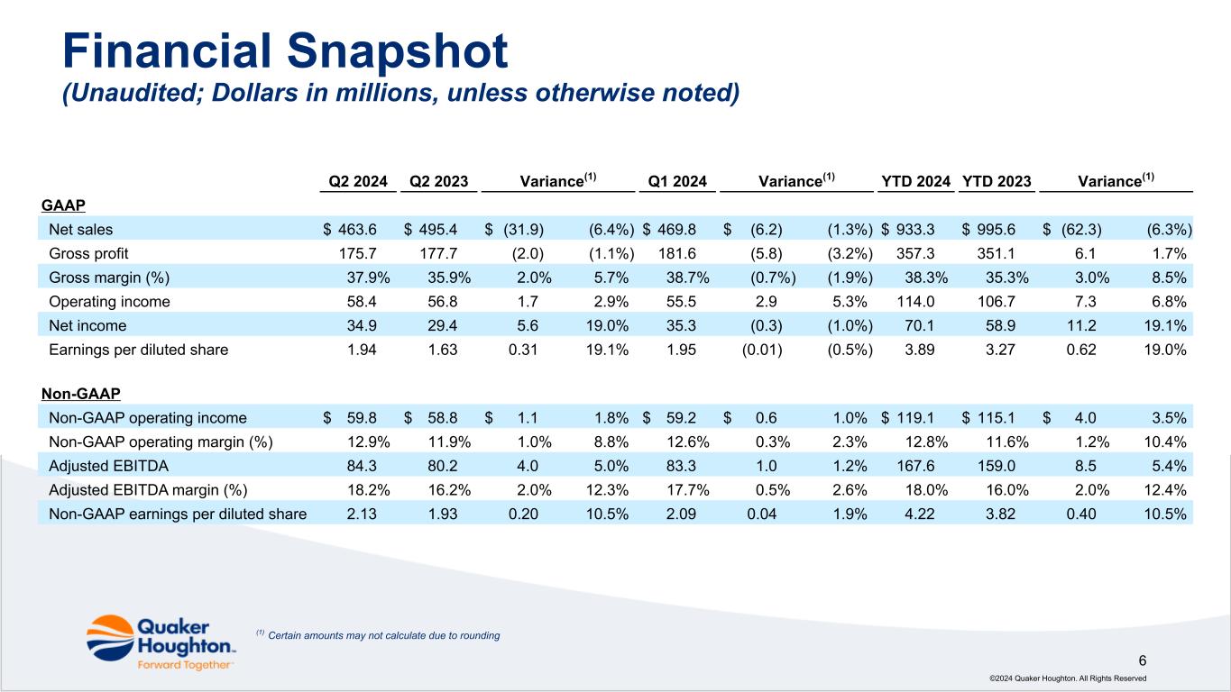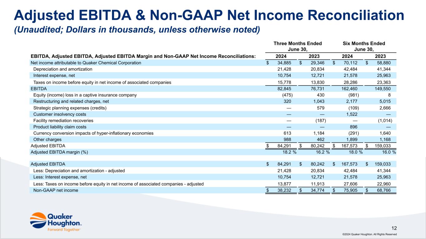 本演示文稿中包含的信息包括非GAAP(未经审计)财务信息,包括EBITDA、调整后EBITDA、调整后EBITDA利润率、非GAAP营业收入、非GAAP营业利润率、非GAAP净收入和非GAAP每股摊薄收益。该公司认为,这些非公认会计准则财务指标提供了有意义的补充信息,因为它们增强了读者对公司财务业绩的理解,表明了公司未来的经营业绩,并有助于不同财政期间的比较,因为非公认会计准则财务指标排除了不被视为未来经营业绩的指示或不被视为公司经营核心的项目。非GAAP结果仅供补充信息之用,不应被视为替代根据GAAP提供的财务信息。此外,我们对EBITDA、调整后EBITDA、调整后EBITDA利润率、非美国通用会计准则营业收入、非美国通用会计准则营业利润率、非美国通用会计准则净利润和非美国通用会计准则每股摊薄收益的定义,如下文讨论并与最具可比性的相应GAAP衡量标准进行了核对,可能无法与其他公司报告的类似名称的衡量标准进行比较。公司在联营公司净收益中列报EBITDA,计算方式为折旧及摊销前归属于公司的净利润、利息支出净额、权益前收入税项。公司还提供调整后的EBITDA,计算方式为EBITDA加上或减去某些不被视为未来经营业绩的指示或不被视为公司经营核心的项目。此外,公司呈列非美国通用会计准则营业收入,计算方式为营业收入加上或减去某些不被视为未来经营业绩指示性或不被视为公司经营核心的项目。调整后EBITDA利润率和非GAAP营业利润率分别计算为调整后EBITDA和非GAAP营业收入占合并净销售额的百分比。该公司认为,这些非公认会计原则措施提供了透明和有用的信息,并被投资者、分析师、我们行业的同行以及管理层广泛用于在一致的基础上评估公司的经营业绩。此外,该公司将非美国通用会计准则下的净收入和非美国通用会计准则下的每股摊薄收益作为额外的业绩衡量标准。非美国通用会计准则净收入的计算方法为调整后的EBITDA,定义见上文,减去折旧和摊销、利息费用、净额以及联营公司净收入中的权益前收入税项,在每种情况下均酌情调整归属于公司的净收入与调整后EBITDA对账中确定的非核心项目所产生的任何折旧、摊销、利息或税收影响。非美国通用会计准则每股摊薄收益按“两类份额法”核算的非美国通用会计准则每股摊薄净收益计算。公司认为,非美国通用会计准则下的净收入和非美国通用会计准则下的每股摊薄收益提供了透明和有用的信息,并被我们行业的投资者、分析师、竞争对手以及管理层广泛用于在一致的基础上评估公司的经营业绩。由于涉及公司2024年预计调整后EBITDA增长,公司没有提供可比GAAP衡量标准的指引,也没有提供前瞻性非GAAP财务衡量标准与最直接可比的美国GAAP衡量标准的量化对账,因为它无法合理确定地确定计算此类衡量标准所必需的某些重要项目的最终结果,而无需做出不合理的努力。这些项目包括但不限于公司可能记录的可能对净收入产生重大影响的某些非经常性或非核心项目。这些项目是不确定的,取决于各种因素,可能会对美国公认会计原则报告的指导期业绩产生重大影响。以下图表应与公司日期为2024年8月5日的第二季度收益新闻稿一起阅读,该新闻稿已通过表格8-K提交给美国证券交易委员会,公司截至2023年12月31日止年度的年度报告,以及公司截至2024年6月30日止期间的10-Q。这些文件可能包含有关以下对账中包含的某些项目的额外解释性语言和信息。© 2024 Quaker Houghton。保留所有权利3项非公认会计原则措施