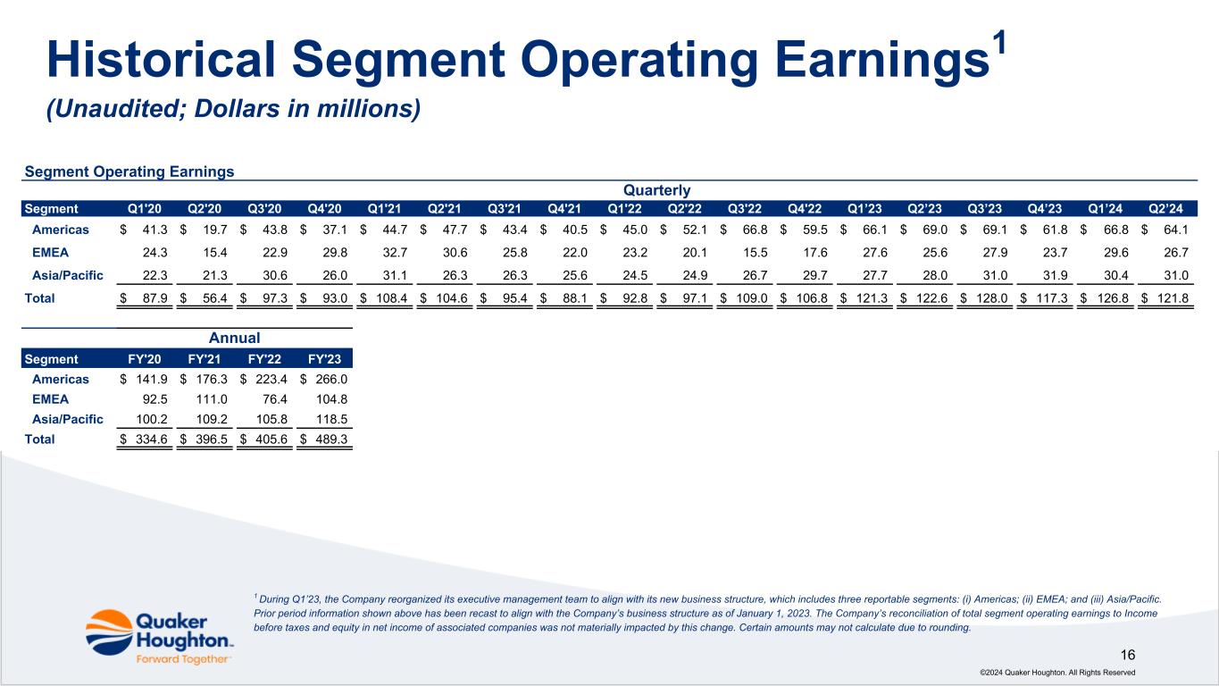历史分部净销售额1(未经审计;百万美元)15 © 2024 Quaker Houghton。保留所有权利1在23年第一季度,公司重组了其执行管理团队,以适应其新的业务结构,其中包括三个可报告分部:(i)美洲;(ii)欧洲、中东和非洲;以及(iii)亚太地区。上述前期信息已重新调整,以符合公司截至2023年1月1日的业务结构。公司将分部总营业利润与税前收入和联营公司净收入中的权益进行对账并未受到这一变化的重大影响。由于四舍五入,某些金额可能无法计算。净销售额季度分部Q1‘20 Q2’20 Q3‘20 Q4’20 Q1‘21 Q2’21 Q3‘21 Q4’21 Q1‘22 Q2’22 Q3‘22 Q4’22 Q1‘23 Q2’23 Q3‘23 Q4’23 Q1‘24 Q2’24 Americas $ 172.6 $ 115.2 $ 159.3 $ 159.9 $ 180.8 $ 186.6 $ 197.4 $ 197.4 $ 212.1 $ 235.8 $ 254.7 $ 243.9 $ 251.4 $ 253.2 $ 245.9 $ 226.6 $ 229.8 $ 223.5 EMEA 123.29 3.91 12.71 26.11 41.11 46.01 42.31 34.71 46.01 42.31 34.81 45.1 35.1 138.41 38.0亚太地区82.77 7.09 5.299.8 107.9 102.7 109.31 15.01 15.3 111.0 103.2 105.1 96.3 98.7 105.1 104.8378.6 $ 286.0 $ 367.2 $ 385.9 $ 429.8 $ 435.3 $ 449.1 $ 447.0 $ 474.2 $ 49 2.4 $ 492.2 $ 484.8 $ 500.1 $ 495.4 $ 490.6 $ 467.1 $ 469.8 $ 463.6年度分部FY‘20 FY’21 FY‘22 FY’23美洲$ 607.0 $ 762.2 $ 946.5 $ 977.1欧洲、中东和非洲地区455.96 4.156 2.55 71.3亚洲/太平洋地区354.74 34.84 34.4 34.6 404.9总计$ 1,417.7 $ 1,761.2 $ 1,943.6 $ 1,953.3