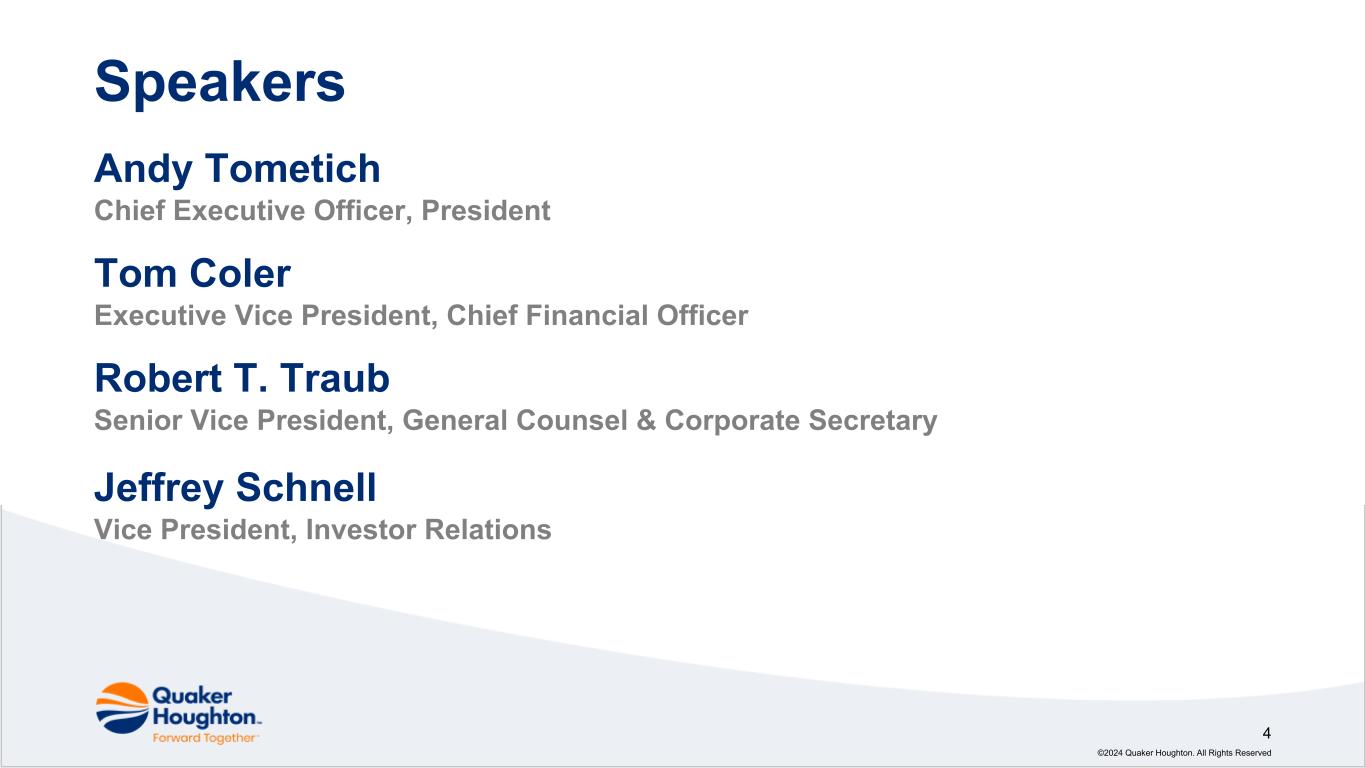 Andy Tometich首席执行官、总裁Tom Coler执行副总裁、首席财务官Robert T. Traub高级副总裁、总法律顾问兼公司秘书Jeffrey Schnell投资者关系副副总裁© 2024 Quaker Houghton。版权所有4位发言人